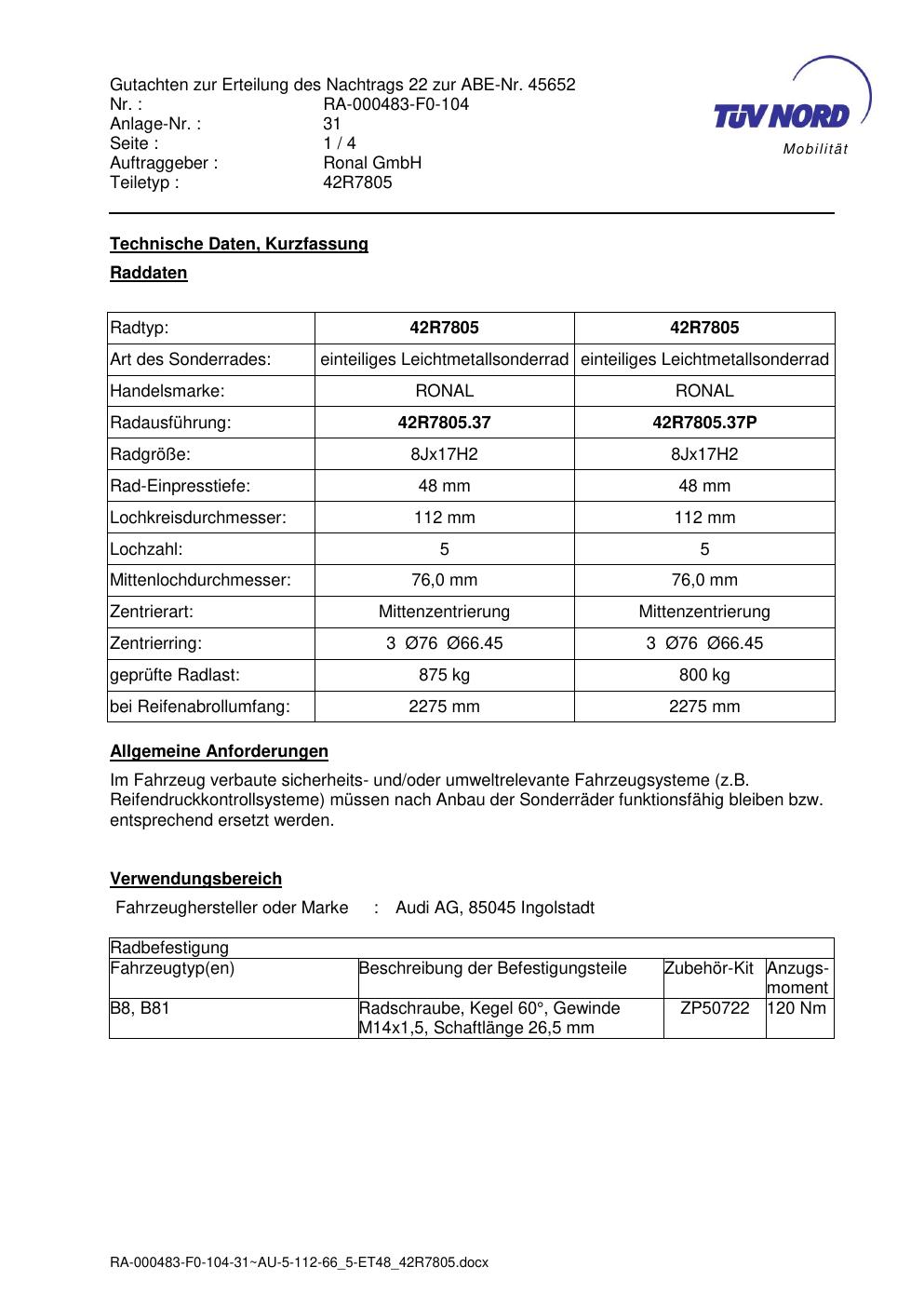 Dieses Gutachten (abe) bezieht sich auf die Alufelge brand-ronal 42R7805 42R7805 in der Ausführung 8Jx17 ET 0, Mittenloch 0 mm (KBA 45652). Im PDF findest du typischerweise zulässige Reifengrößen, Auflagen/Anbauhinweise und – je nach Dokument – Hinweise zur Eintragung.