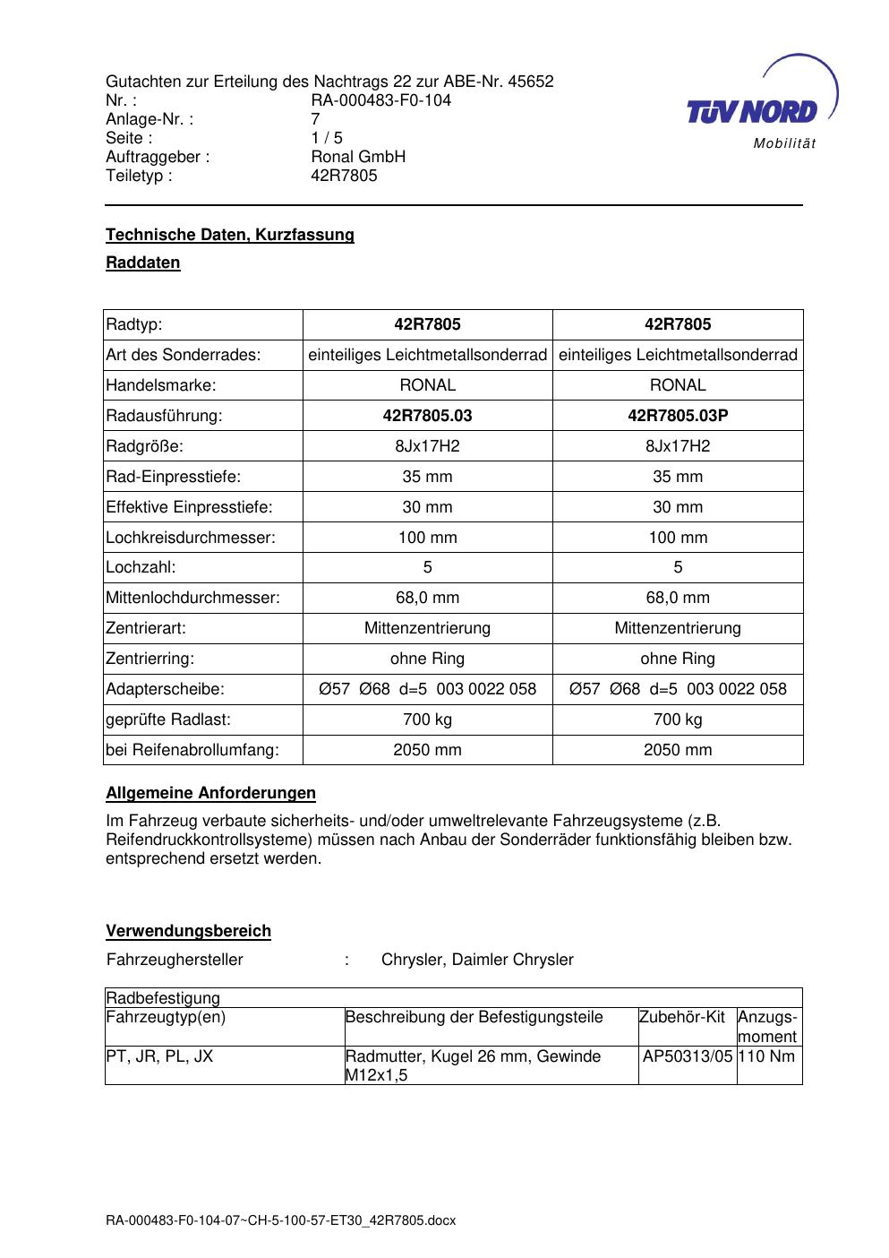 Dieses Gutachten (abe) bezieht sich auf die Alufelge brand-ronal 42R7805 42R7805 in der Ausführung 8Jx17 ET 0, Mittenloch 0 mm (KBA 45652). Im PDF findest du typischerweise zulässige Reifengrößen, Auflagen/Anbauhinweise und – je nach Dokument – Hinweise zur Eintragung.