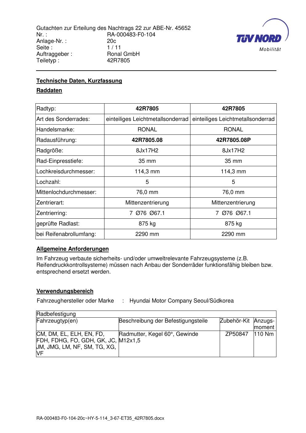 Dieses Gutachten (abe) bezieht sich auf die Alufelge brand-ronal 42R7805 42R7805 in der Ausführung 8Jx17 ET 0, Mittenloch 0 mm (KBA 45652). Im PDF findest du typischerweise zulässige Reifengrößen, Auflagen/Anbauhinweise und – je nach Dokument – Hinweise zur Eintragung.