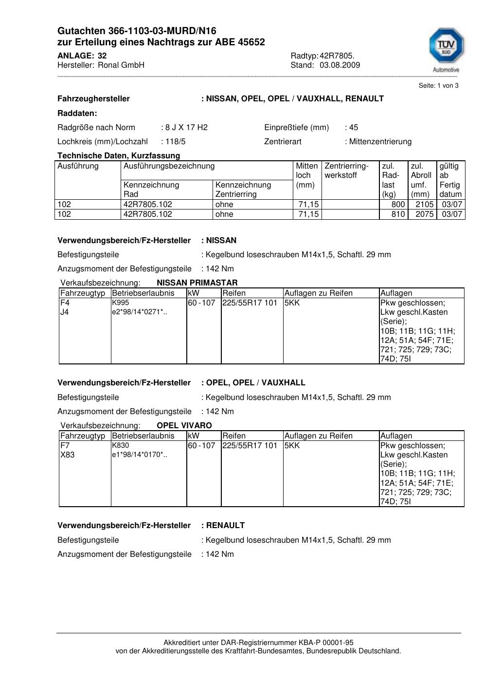 Dieses Gutachten (abe) bezieht sich auf die Alufelge Ronal 42R7805 in der Ausführung 8Jx17 ET 0, Mittenloch 0 mm (KBA 45652). Im PDF findest du typischerweise zulässige Reifengrößen, Auflagen/Anbauhinweise und – je nach Dokument – Hinweise zur Eintragung.
