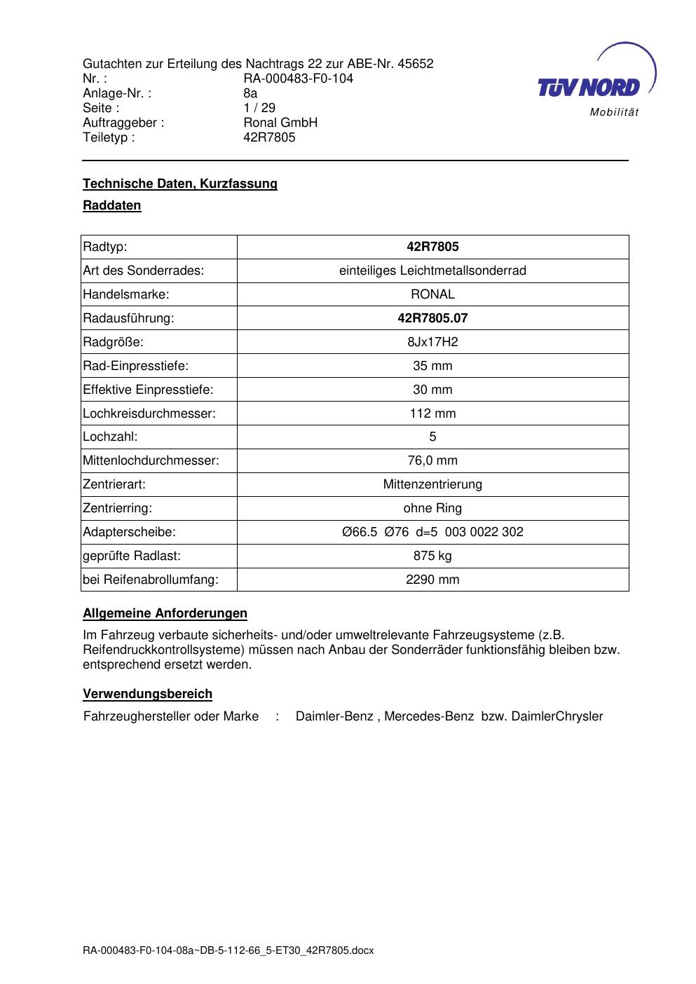 Dieses Gutachten (abe) bezieht sich auf die Alufelge brand-ronal 42R7805 in der Ausführung 8Jx17 ET 0, Mittenloch 0 mm (KBA 45652). Im PDF findest du typischerweise zulässige Reifengrößen, Auflagen/Anbauhinweise und – je nach Dokument – Hinweise zur Eintragung.