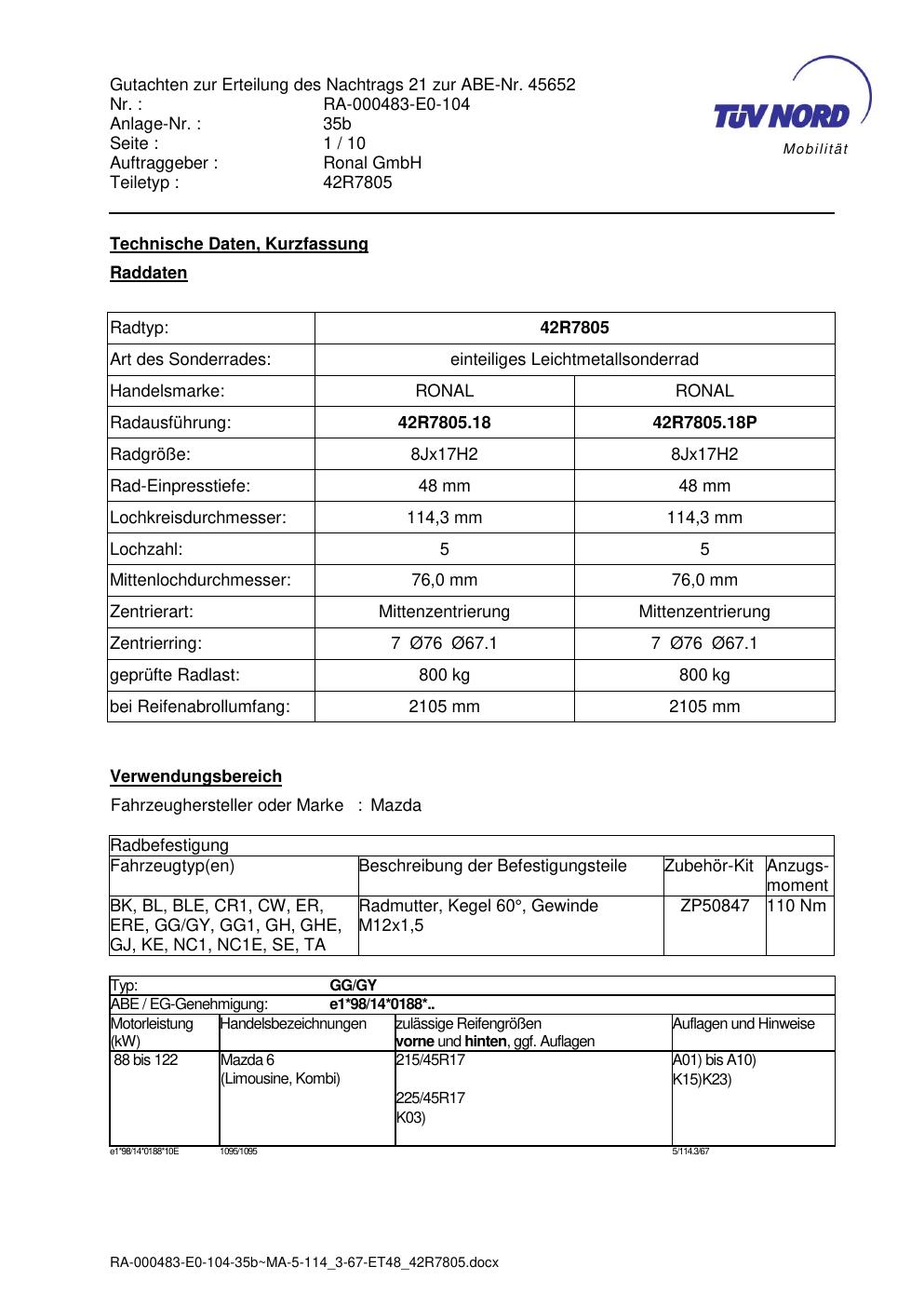 Dieses Gutachten (abe) bezieht sich auf die Alufelge brand-ronal 42R7805 in der Ausführung 8Jx17 ET 0, Mittenloch 0 mm (KBA 45652). Im PDF findest du typischerweise zulässige Reifengrößen, Auflagen/Anbauhinweise und – je nach Dokument – Hinweise zur Eintragung.