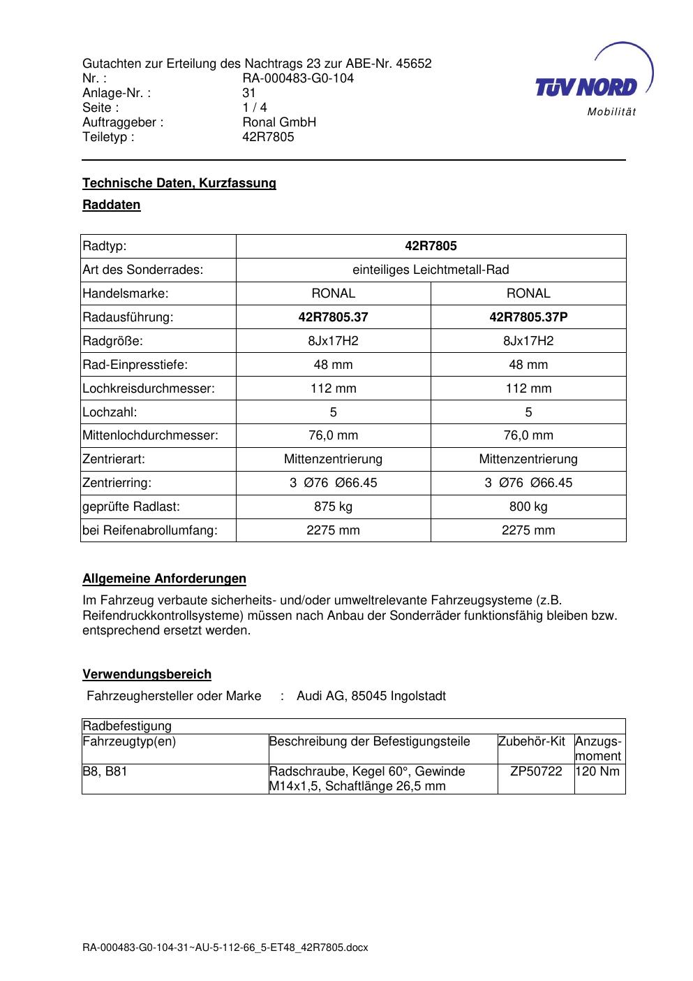 Dieses Gutachten (abe) bezieht sich auf die Alufelge brand-ronal 42R7805 in der Ausführung 8Jx17 ET 0, Mittenloch 0 mm (KBA 45652). Im PDF findest du typischerweise zulässige Reifengrößen, Auflagen/Anbauhinweise und – je nach Dokument – Hinweise zur Eintragung.