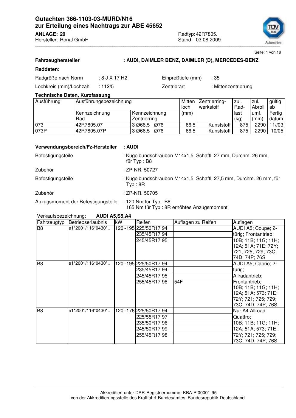 Dieses Gutachten (abe) bezieht sich auf die Alufelge Ronal 42R7805 in der Ausführung 8Jx17 ET 0, Mittenloch 0 mm (KBA 45652). Im PDF findest du typischerweise zulässige Reifengrößen, Auflagen/Anbauhinweise und – je nach Dokument – Hinweise zur Eintragung.