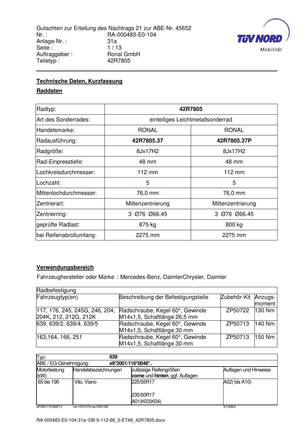 Dieses Gutachten (abe) bezieht sich auf die Alufelge brand-ronal 42R7805 in der Ausführung 8Jx17 ET 0, Mittenloch 0 mm (KBA 45652). Im PDF findest du typischerweise zulässige Reifengrößen, Auflagen/Anbauhinweise und – je nach Dokument – Hinweise zur Eintragung.