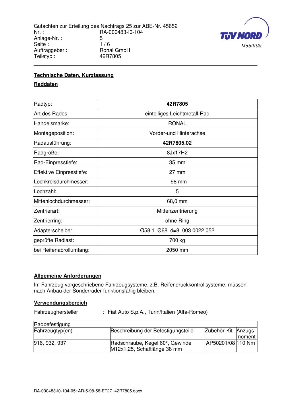Dieses Gutachten (abe) bezieht sich auf die Alufelge brand-ronal 42R7805 in der Ausführung 8Jx17 ET 0, Mittenloch 0 mm (KBA 45652). Im PDF findest du typischerweise zulässige Reifengrößen, Auflagen/Anbauhinweise und – je nach Dokument – Hinweise zur Eintragung.