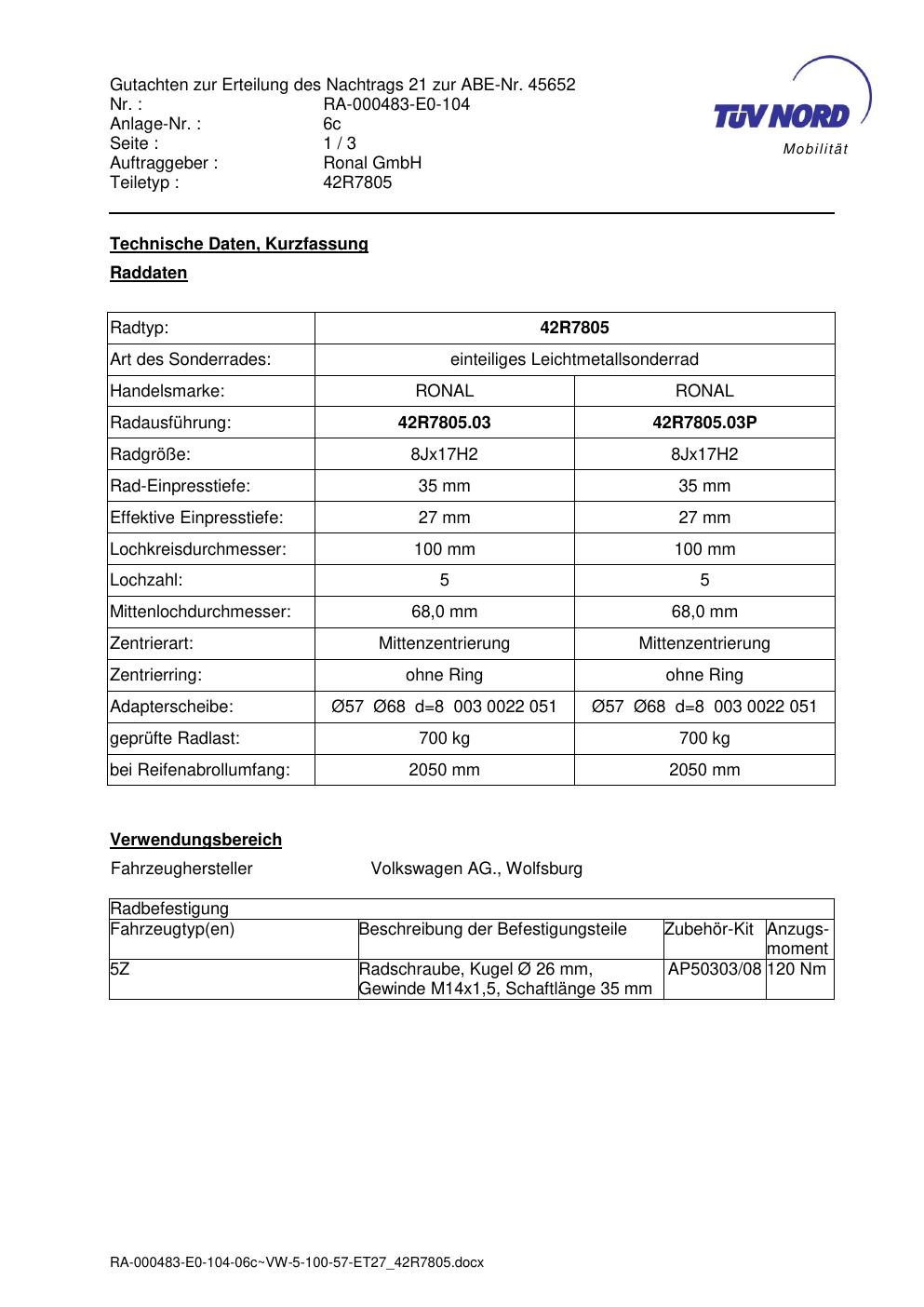Dieses Gutachten (abe) bezieht sich auf die Alufelge brand-ronal 42R7805 in der Ausführung 8Jx17 ET 0, Mittenloch 0 mm (KBA 45652). Im PDF findest du typischerweise zulässige Reifengrößen, Auflagen/Anbauhinweise und – je nach Dokument – Hinweise zur Eintragung.