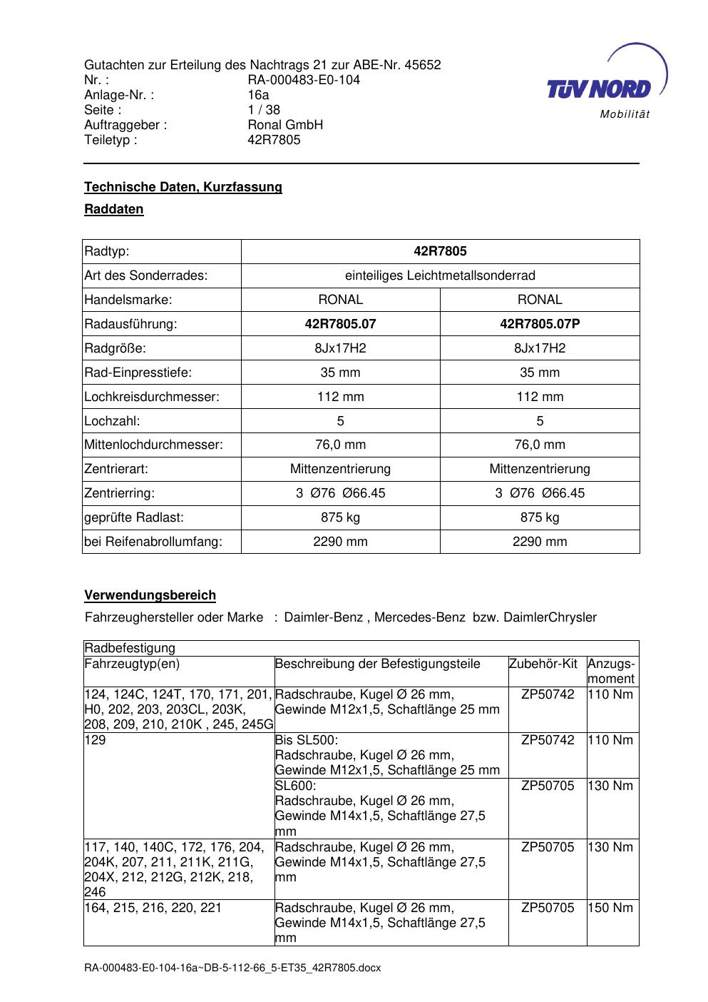 Dieses Gutachten (abe) bezieht sich auf die Alufelge brand-ronal 42R7805 in der Ausführung 8Jx17 ET 0, Mittenloch 0 mm (KBA 45652). Im PDF findest du typischerweise zulässige Reifengrößen, Auflagen/Anbauhinweise und – je nach Dokument – Hinweise zur Eintragung.
