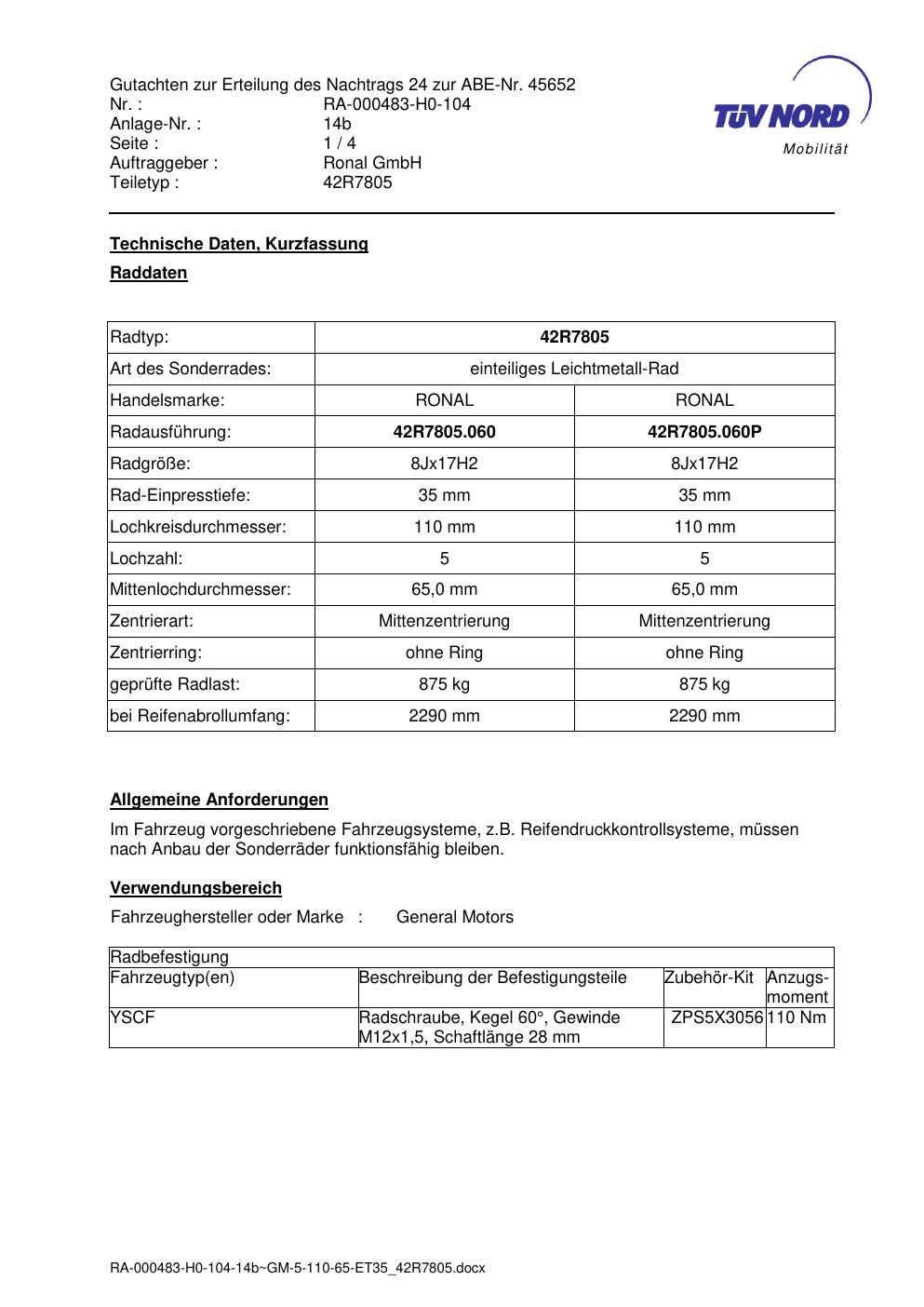 Dieses Gutachten (abe) bezieht sich auf die Alufelge brand-ronal 42R7805 in der Ausführung 8Jx17 ET 0, Mittenloch 0 mm (KBA 45652). Im PDF findest du typischerweise zulässige Reifengrößen, Auflagen/Anbauhinweise und – je nach Dokument – Hinweise zur Eintragung.