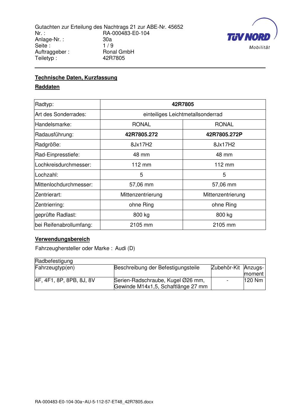 Dieses Gutachten (abe) bezieht sich auf die Alufelge brand-ronal 42R7805 in der Ausführung 8Jx17 ET 0, Mittenloch 0 mm (KBA 45652). Im PDF findest du typischerweise zulässige Reifengrößen, Auflagen/Anbauhinweise und – je nach Dokument – Hinweise zur Eintragung.