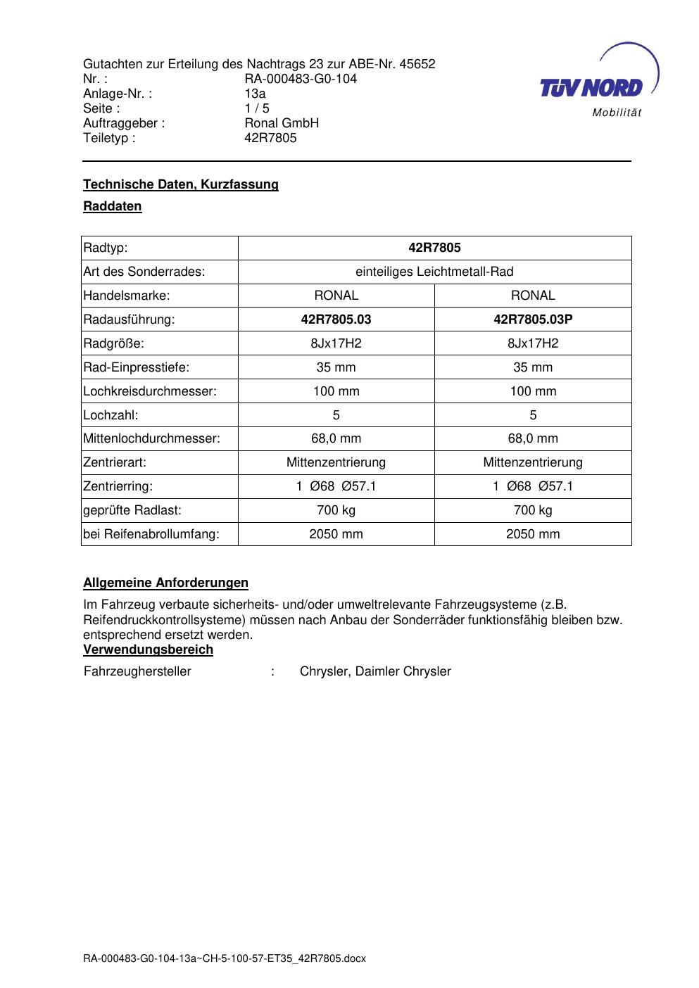 Dieses Gutachten (abe) bezieht sich auf die Alufelge brand-ronal 42R7805 in der Ausführung 8Jx17 ET 0, Mittenloch 0 mm (KBA 45652). Im PDF findest du typischerweise zulässige Reifengrößen, Auflagen/Anbauhinweise und – je nach Dokument – Hinweise zur Eintragung.