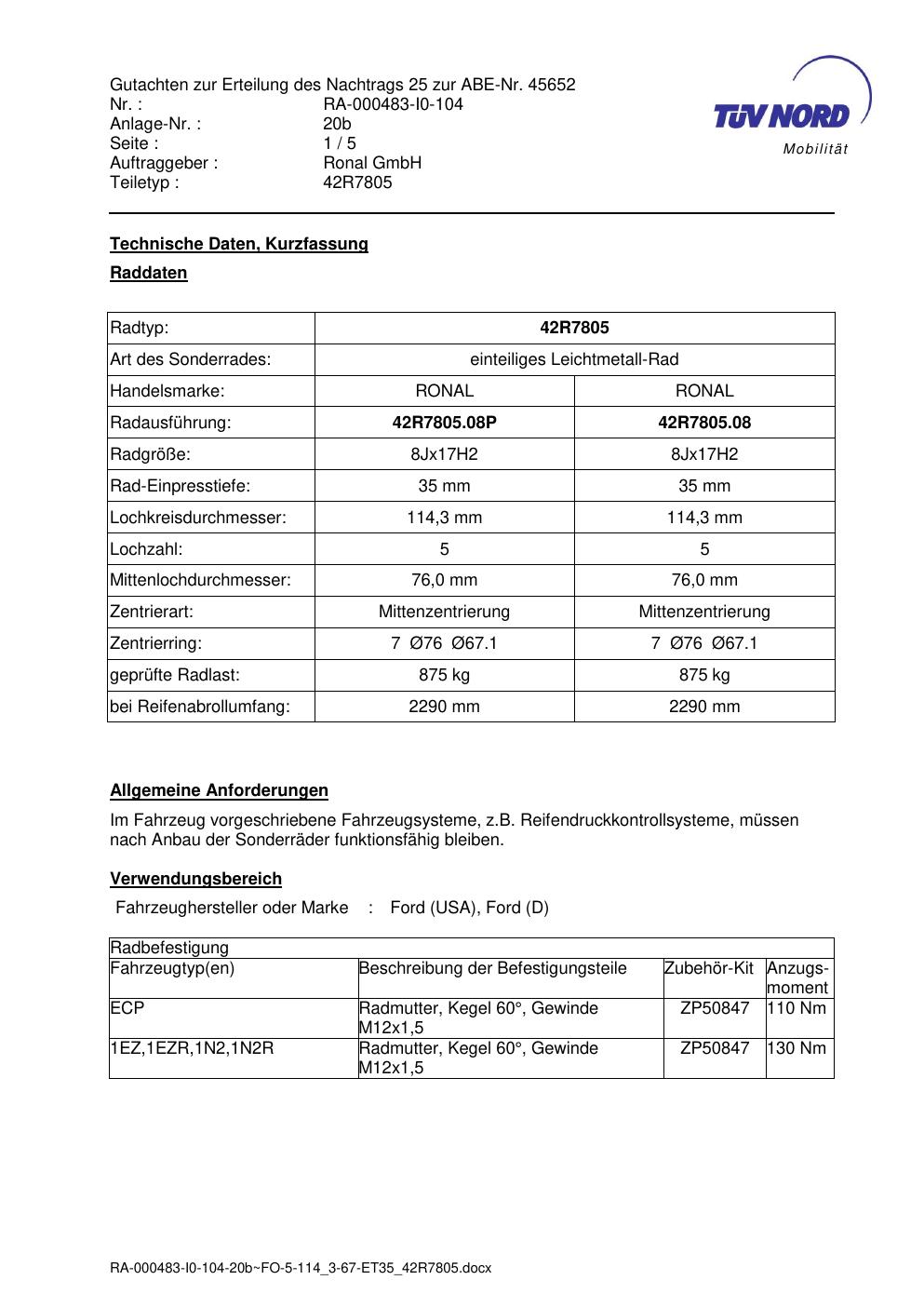 Dieses Gutachten (abe) bezieht sich auf die Alufelge brand-ronal 42R7805 in der Ausführung 8Jx17 ET 0, Mittenloch 0 mm (KBA 45652). Im PDF findest du typischerweise zulässige Reifengrößen, Auflagen/Anbauhinweise und – je nach Dokument – Hinweise zur Eintragung.