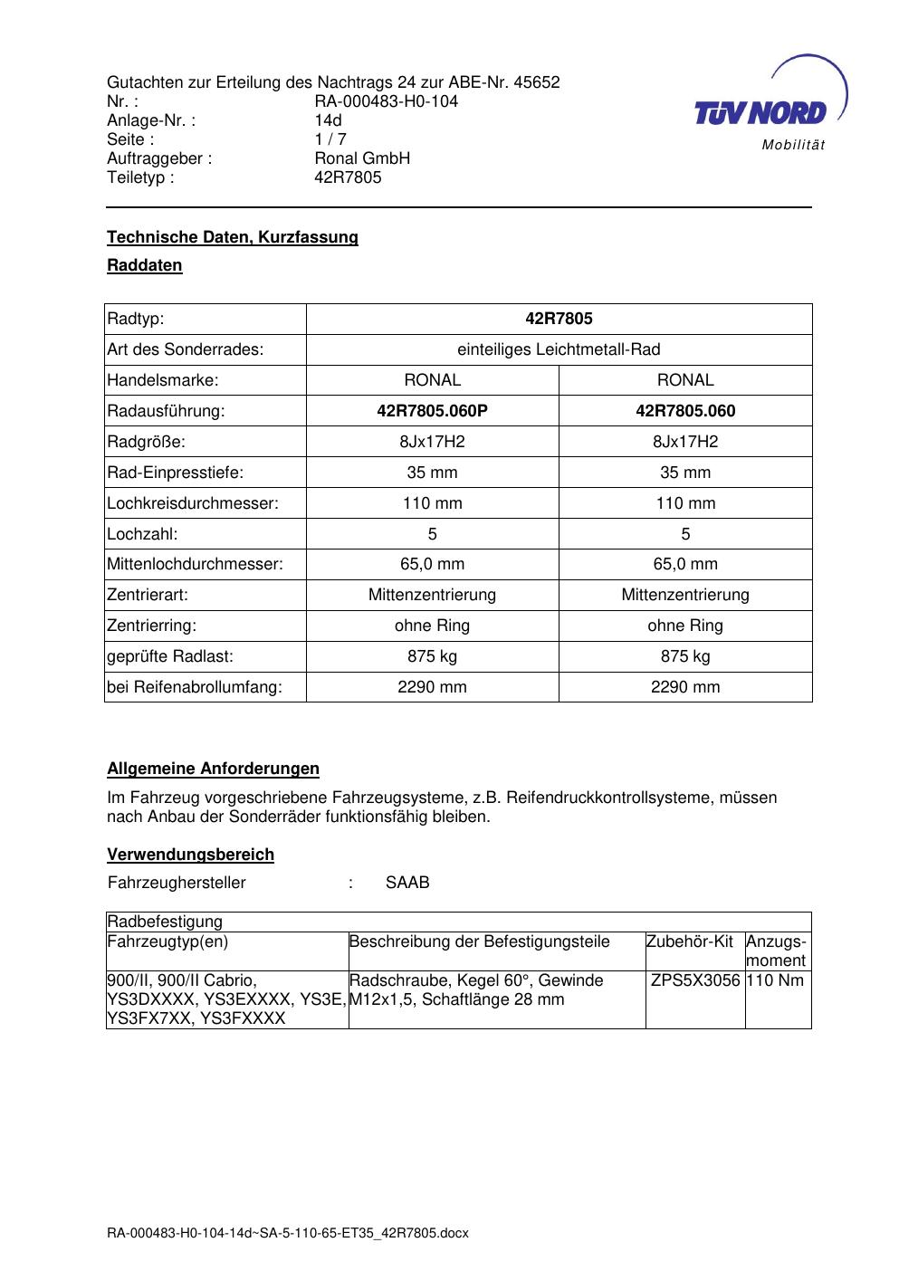 Dieses Gutachten (abe) bezieht sich auf die Alufelge brand-ronal 42R7805 in der Ausführung 8Jx17 ET 0, Mittenloch 0 mm (KBA 45652). Im PDF findest du typischerweise zulässige Reifengrößen, Auflagen/Anbauhinweise und – je nach Dokument – Hinweise zur Eintragung.