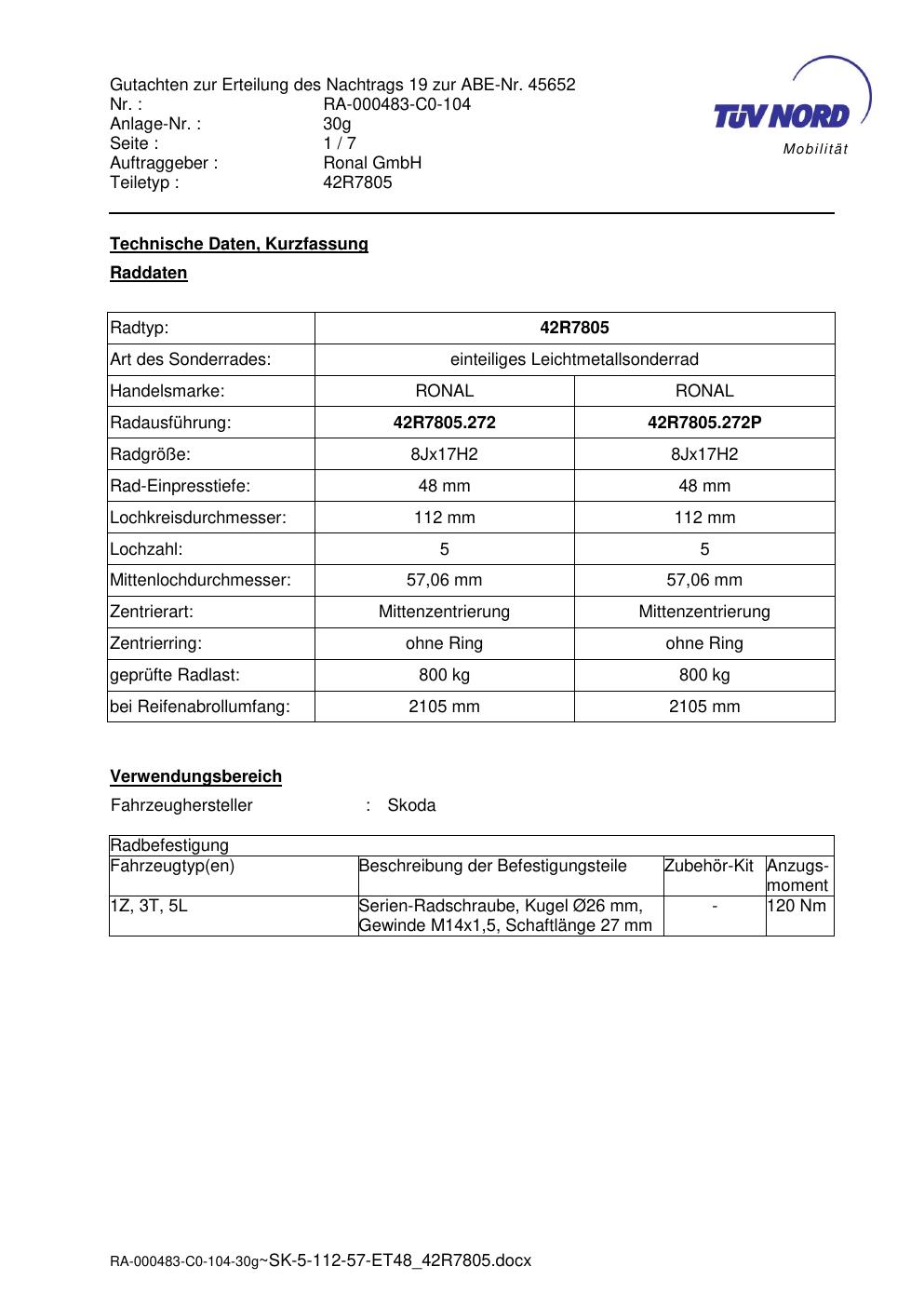 Dieses Gutachten (abe) bezieht sich auf die Alufelge brand-ronal 42R7805 in der Ausführung 8Jx17 ET 0, Mittenloch 0 mm (KBA 45652). Im PDF findest du typischerweise zulässige Reifengrößen, Auflagen/Anbauhinweise und – je nach Dokument – Hinweise zur Eintragung.