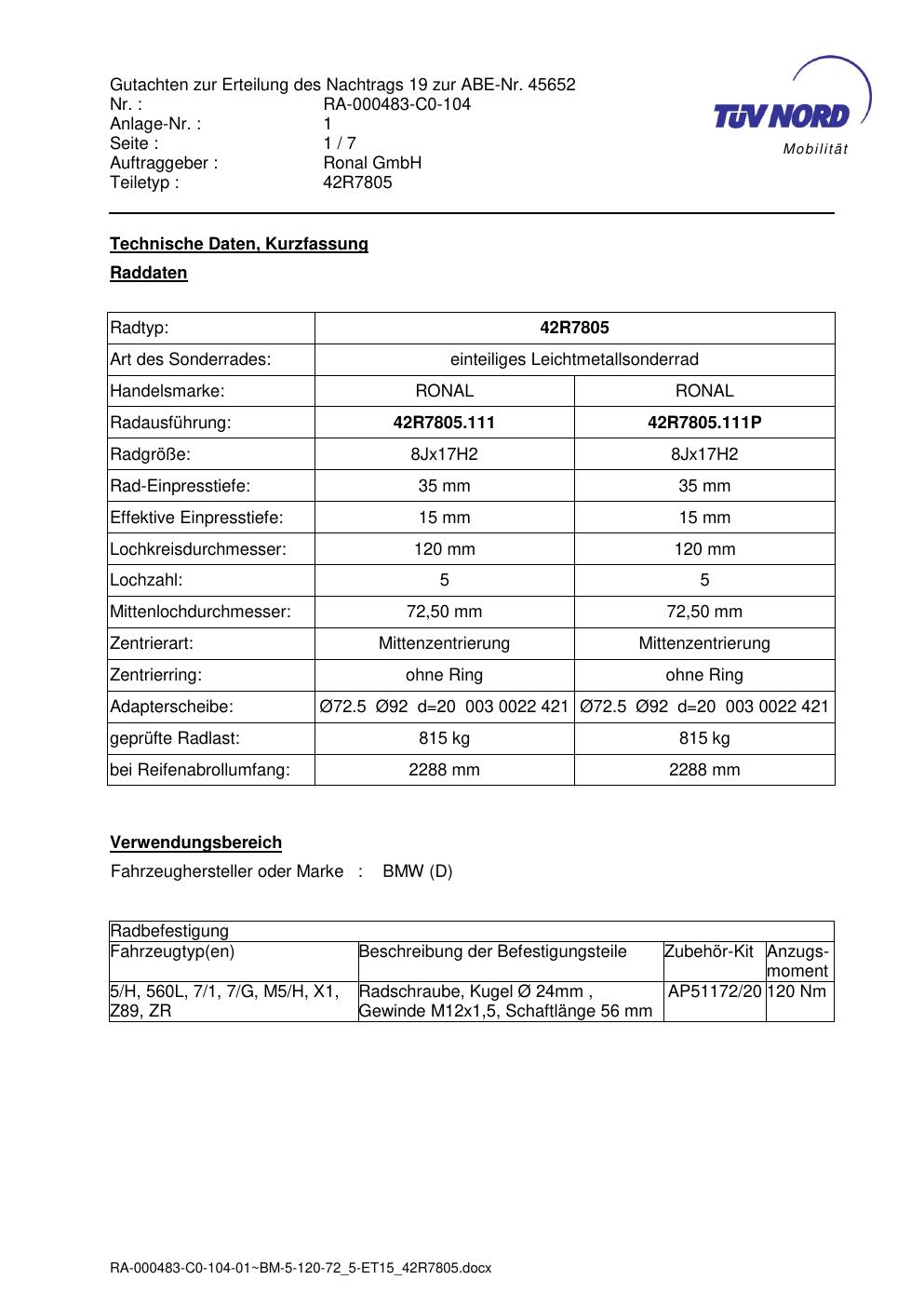 Dieses Gutachten (abe) bezieht sich auf die Alufelge brand-ronal 42R7805 in der Ausführung 8Jx17 ET 0, Mittenloch 0 mm (KBA 45652). Im PDF findest du typischerweise zulässige Reifengrößen, Auflagen/Anbauhinweise und – je nach Dokument – Hinweise zur Eintragung.