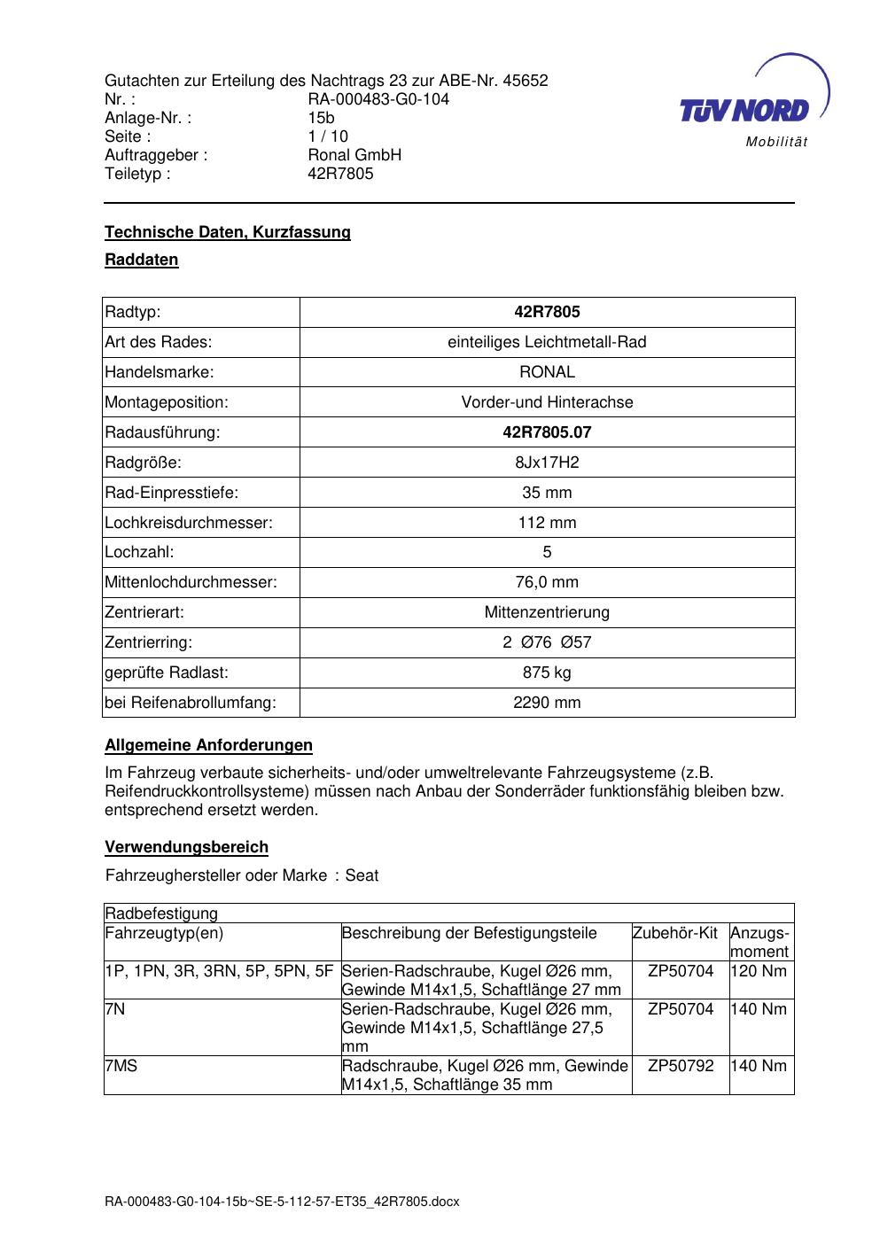 Dieses Gutachten (abe) bezieht sich auf die Alufelge brand-ronal 42R7805 in der Ausführung 8Jx17 ET 0, Mittenloch 0 mm (KBA 45652). Im PDF findest du typischerweise zulässige Reifengrößen, Auflagen/Anbauhinweise und – je nach Dokument – Hinweise zur Eintragung.
