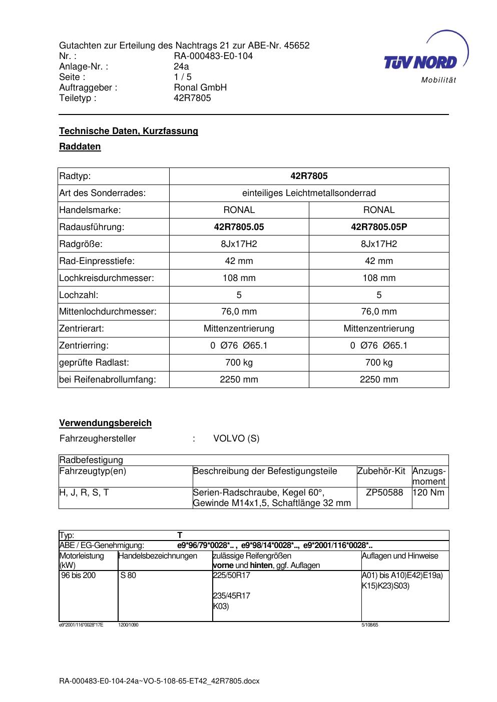 Dieses Gutachten (abe) bezieht sich auf die Alufelge brand-ronal 42R7805 in der Ausführung 8Jx17 ET 0, Mittenloch 0 mm (KBA 45652). Im PDF findest du typischerweise zulässige Reifengrößen, Auflagen/Anbauhinweise und – je nach Dokument – Hinweise zur Eintragung.