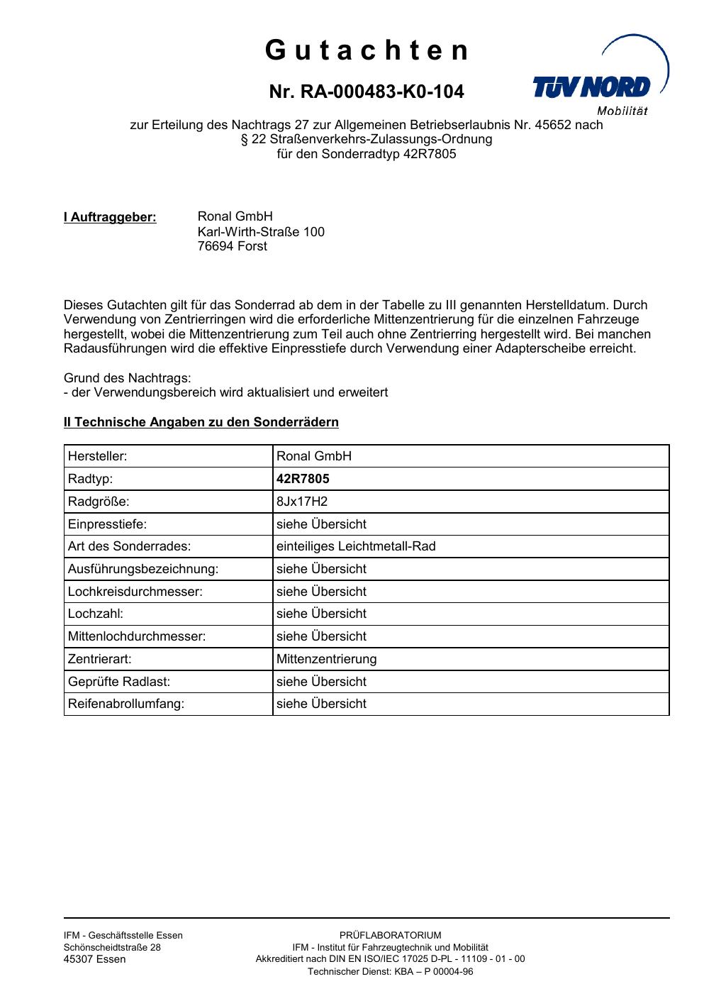 Dieses Gutachten (abe) bezieht sich auf die Alufelge brand-ronal 42R7805 in der Ausführung 8Jx17 ET 0, Mittenloch 0 mm (KBA 45652). Im PDF findest du typischerweise zulässige Reifengrößen, Auflagen/Anbauhinweise und – je nach Dokument – Hinweise zur Eintragung.