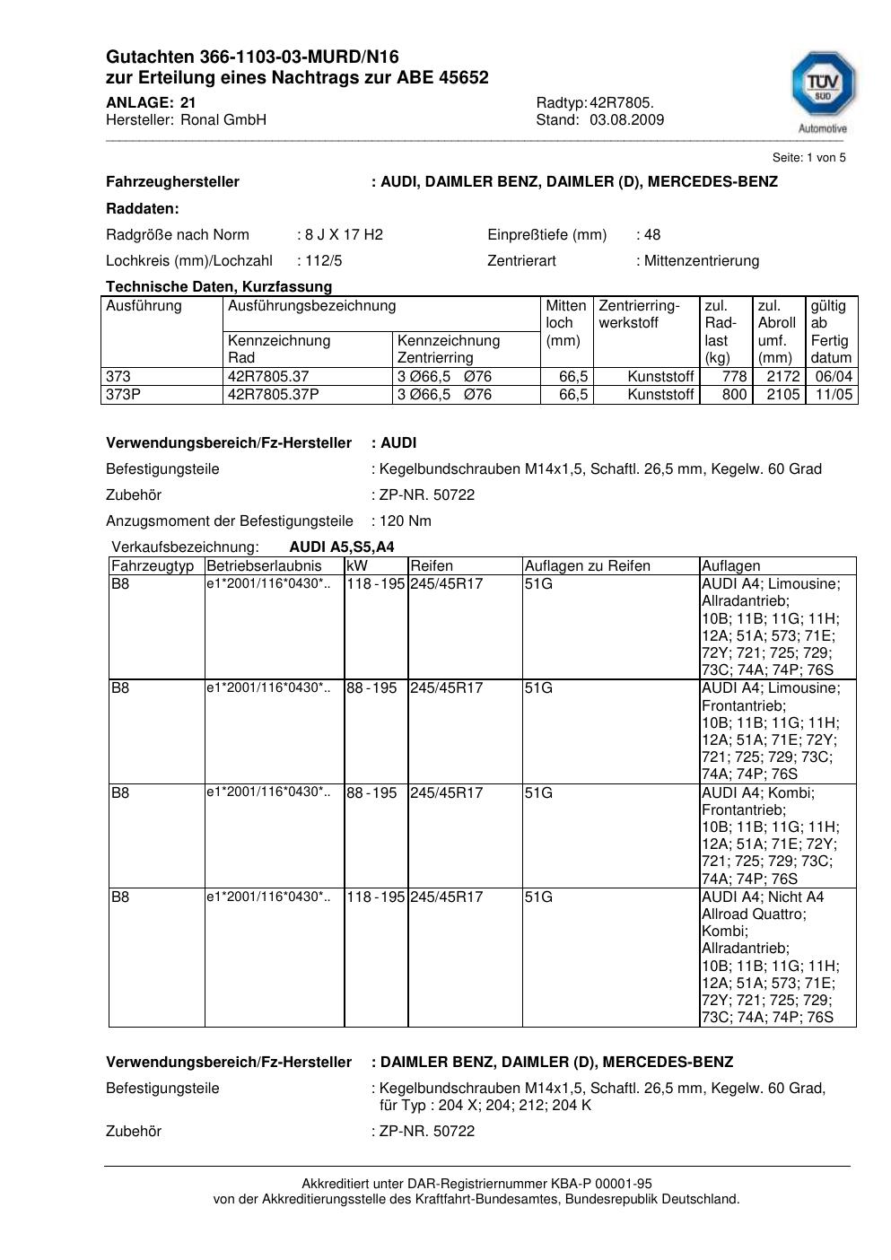 Dieses Gutachten (abe) bezieht sich auf die Alufelge Ronal 42R7805 in der Ausführung 8Jx17 ET 0, Mittenloch 0 mm (KBA 45652). Im PDF findest du typischerweise zulässige Reifengrößen, Auflagen/Anbauhinweise und – je nach Dokument – Hinweise zur Eintragung.