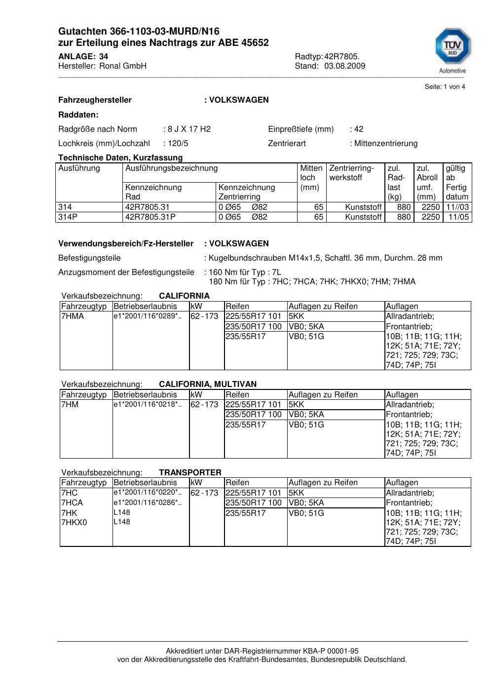 Dieses Gutachten (abe) bezieht sich auf die Alufelge Ronal 42R7805 in der Ausführung 8Jx17 ET 0, Mittenloch 0 mm (KBA 45652). Im PDF findest du typischerweise zulässige Reifengrößen, Auflagen/Anbauhinweise und – je nach Dokument – Hinweise zur Eintragung.
