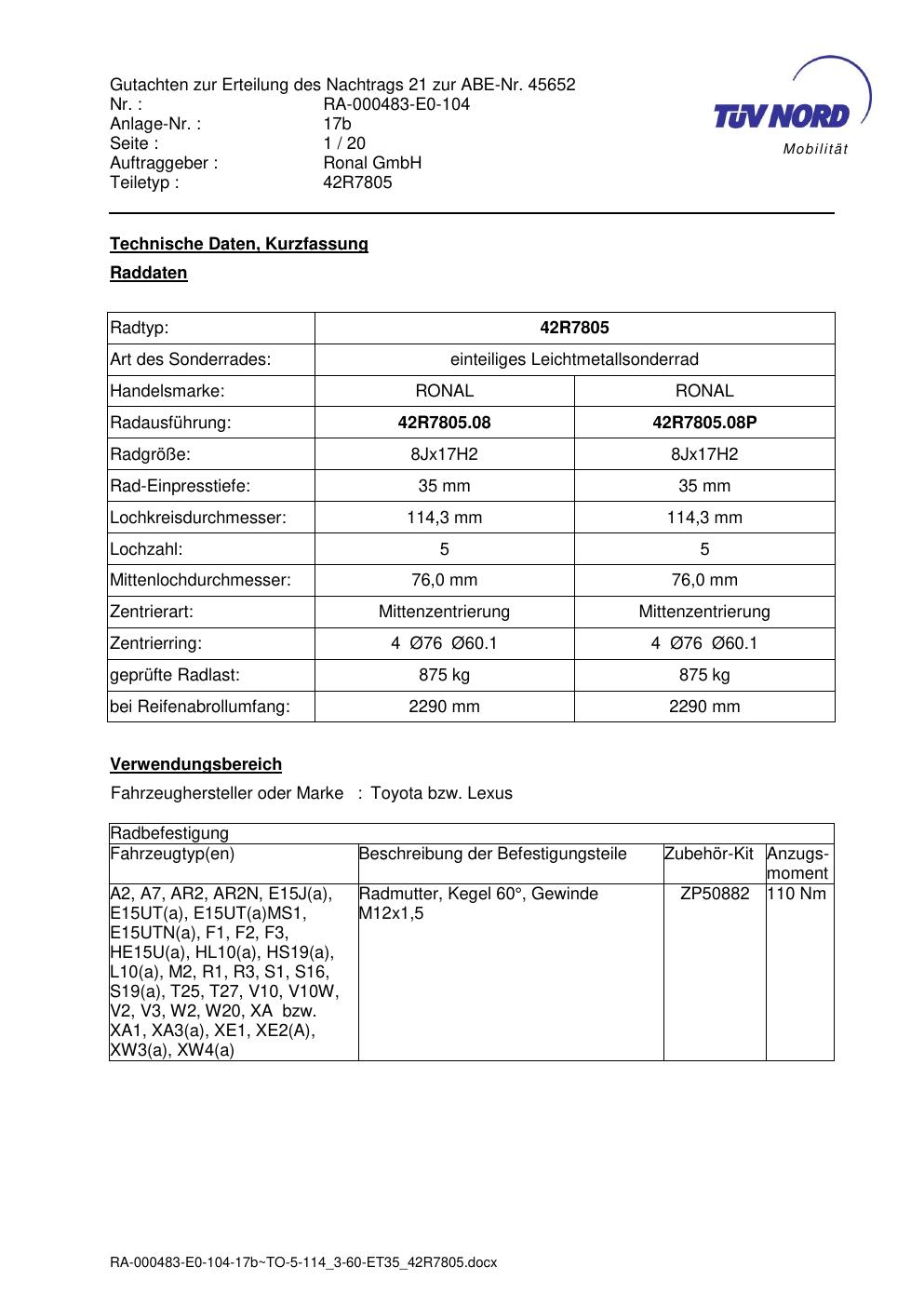 Dieses Gutachten (abe) bezieht sich auf die Alufelge brand-ronal 42R7805 in der Ausführung 8Jx17 ET 0, Mittenloch 0 mm (KBA 45652). Im PDF findest du typischerweise zulässige Reifengrößen, Auflagen/Anbauhinweise und – je nach Dokument – Hinweise zur Eintragung.