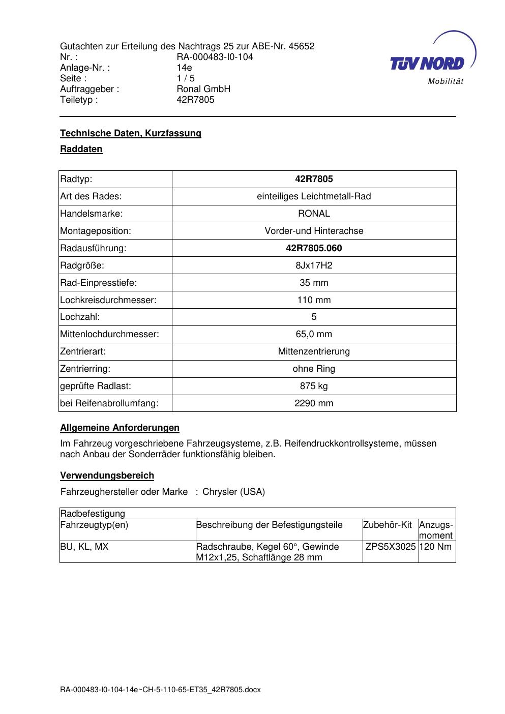 Dieses Gutachten (abe) bezieht sich auf die Alufelge brand-ronal 42R7805 in der Ausführung 8Jx17 ET 0, Mittenloch 0 mm (KBA 45652). Im PDF findest du typischerweise zulässige Reifengrößen, Auflagen/Anbauhinweise und – je nach Dokument – Hinweise zur Eintragung.