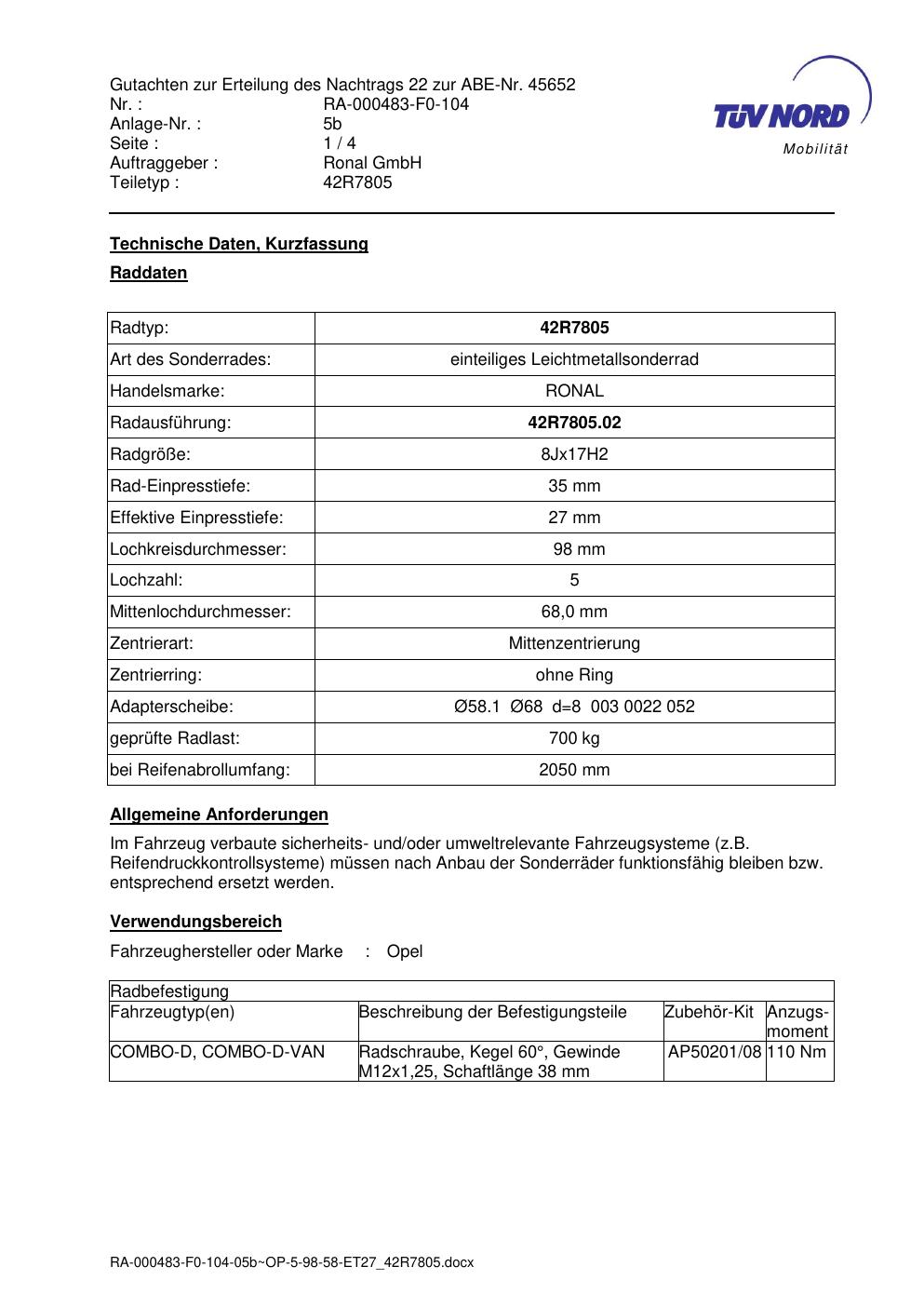 Dieses Gutachten (abe) bezieht sich auf die Alufelge brand-ronal 42R7805 in der Ausführung 8Jx17 ET 0, Mittenloch 0 mm (KBA 45652). Im PDF findest du typischerweise zulässige Reifengrößen, Auflagen/Anbauhinweise und – je nach Dokument – Hinweise zur Eintragung.