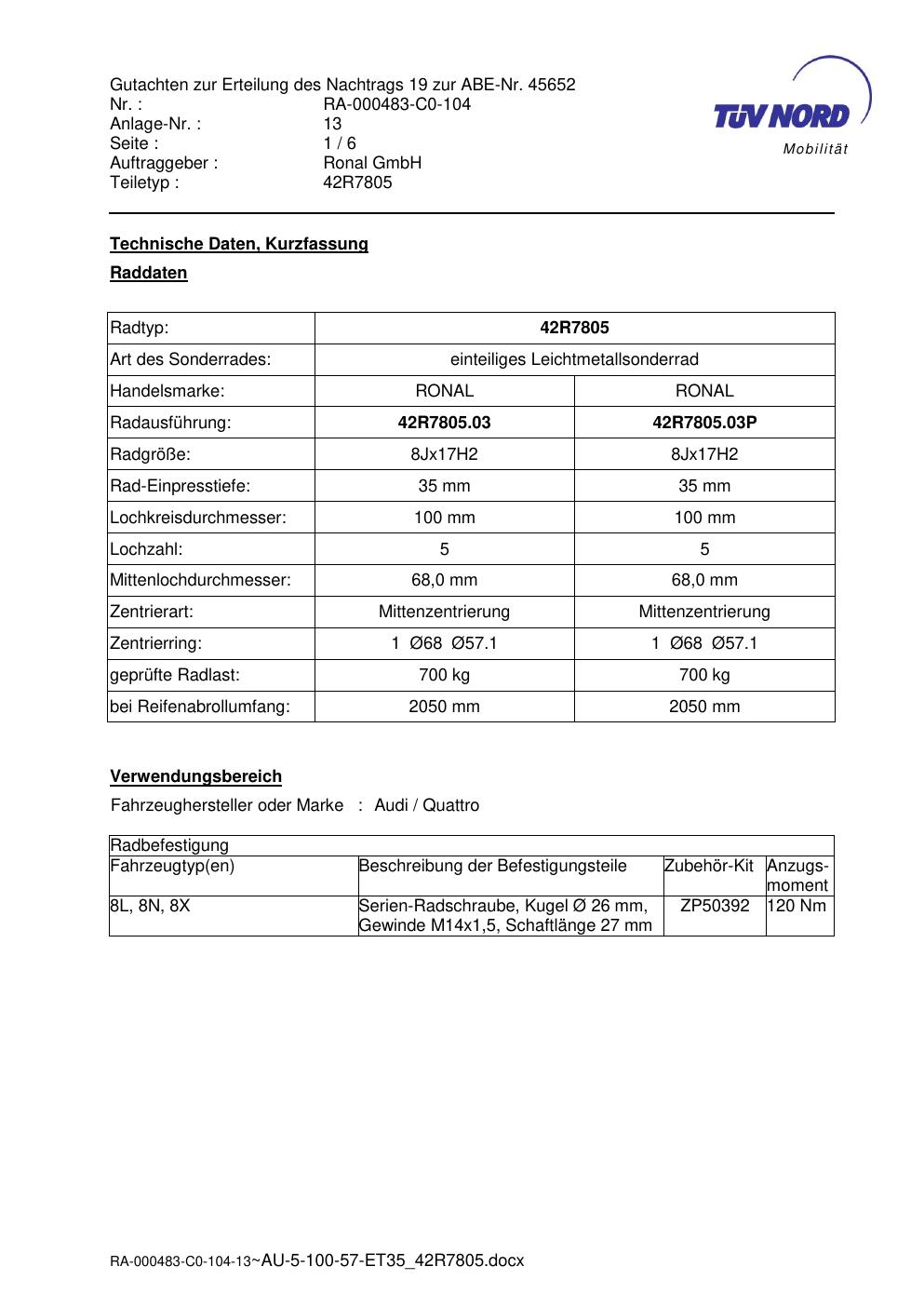 Dieses Gutachten (abe) bezieht sich auf die Alufelge brand-ronal 42R7805 in der Ausführung 8Jx17 ET 0, Mittenloch 0 mm (KBA 45652). Im PDF findest du typischerweise zulässige Reifengrößen, Auflagen/Anbauhinweise und – je nach Dokument – Hinweise zur Eintragung.