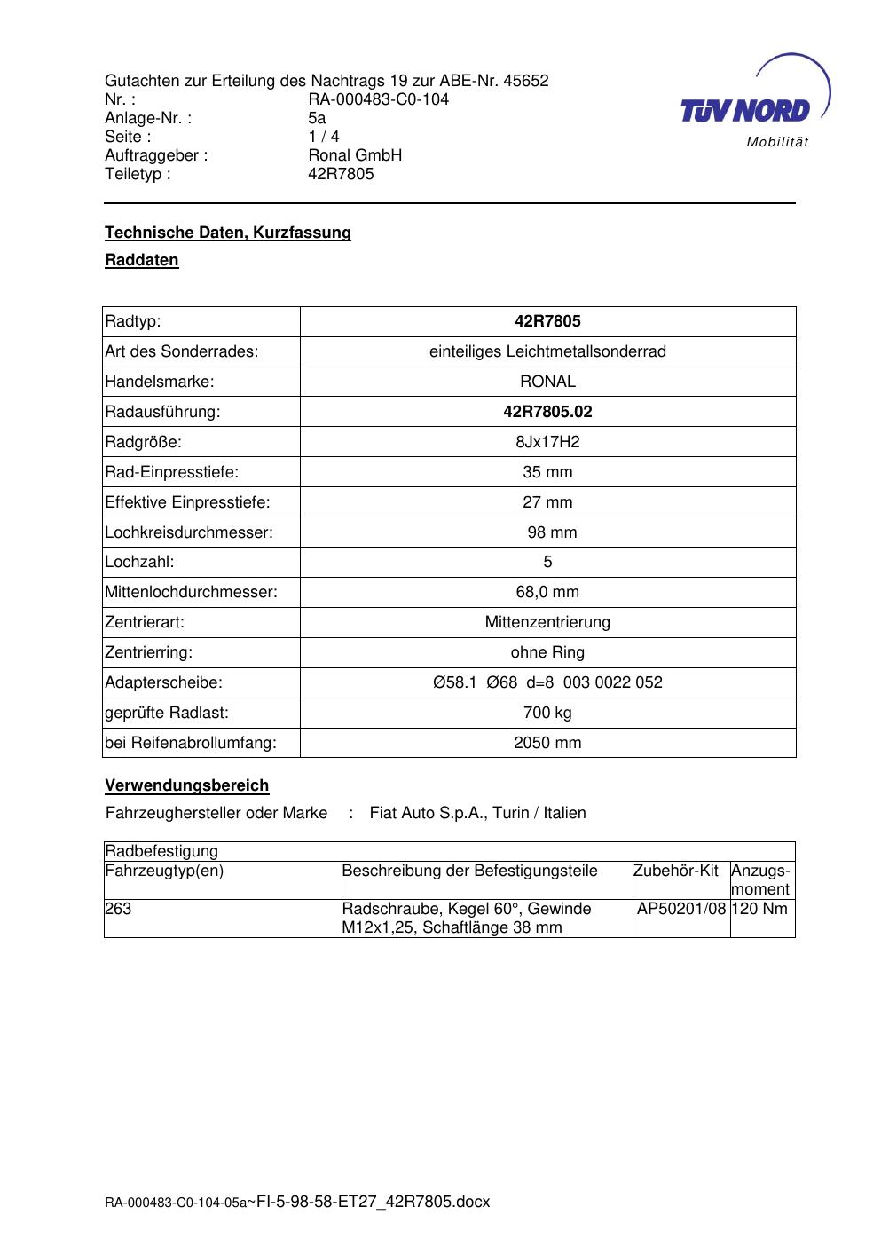 Dieses Gutachten (abe) bezieht sich auf die Alufelge brand-ronal 42R7805 in der Ausführung 8Jx17 ET 0, Mittenloch 0 mm (KBA 45652). Im PDF findest du typischerweise zulässige Reifengrößen, Auflagen/Anbauhinweise und – je nach Dokument – Hinweise zur Eintragung.