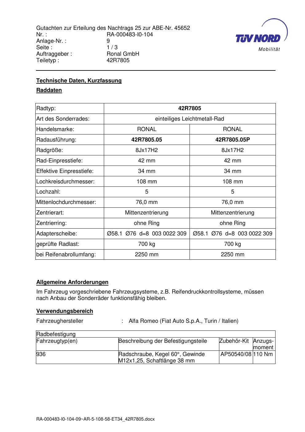 Dieses Gutachten (abe) bezieht sich auf die Alufelge brand-ronal 42R7805 in der Ausführung 8Jx17 ET 0, Mittenloch 0 mm (KBA 45652). Im PDF findest du typischerweise zulässige Reifengrößen, Auflagen/Anbauhinweise und – je nach Dokument – Hinweise zur Eintragung.