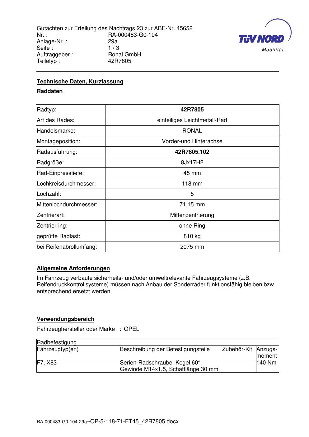 Dieses Gutachten (abe) bezieht sich auf die Alufelge brand-ronal 42R7805 in der Ausführung 8Jx17 ET 0, Mittenloch 0 mm (KBA 45652). Im PDF findest du typischerweise zulässige Reifengrößen, Auflagen/Anbauhinweise und – je nach Dokument – Hinweise zur Eintragung.