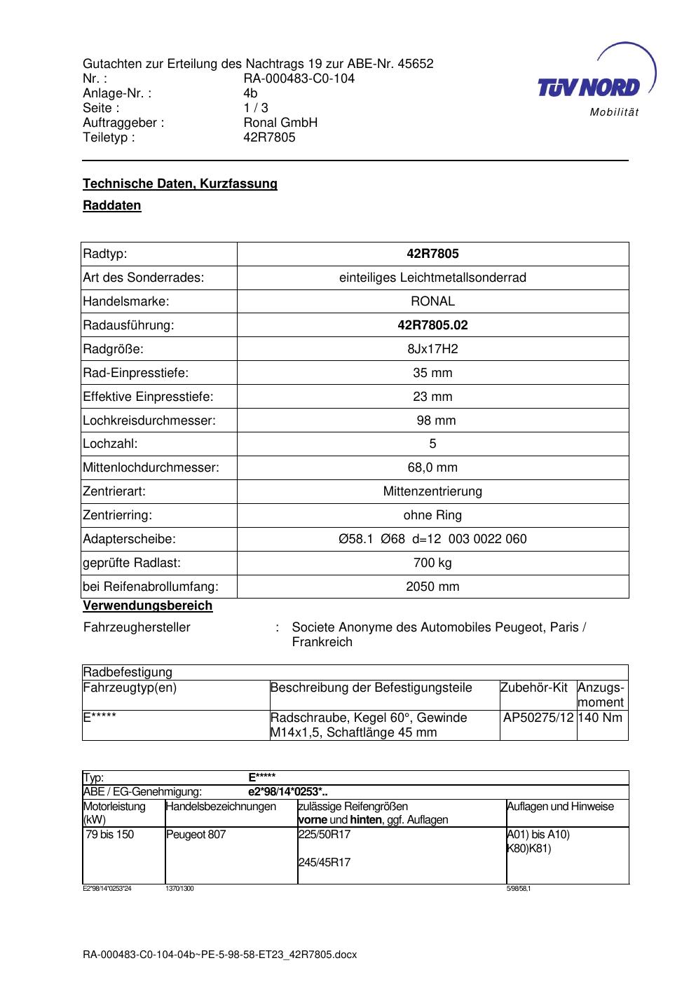 Dieses Gutachten (abe) bezieht sich auf die Alufelge brand-ronal 42R7805 in der Ausführung 8Jx17 ET 0, Mittenloch 0 mm (KBA 45652). Im PDF findest du typischerweise zulässige Reifengrößen, Auflagen/Anbauhinweise und – je nach Dokument – Hinweise zur Eintragung.