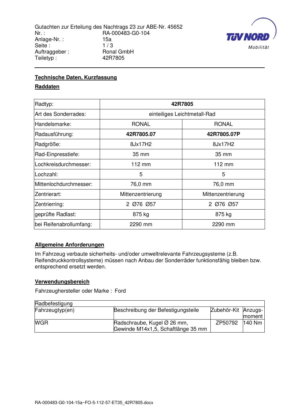 Dieses Gutachten (abe) bezieht sich auf die Alufelge brand-ronal 42R7805 in der Ausführung 8Jx17 ET 0, Mittenloch 0 mm (KBA 45652). Im PDF findest du typischerweise zulässige Reifengrößen, Auflagen/Anbauhinweise und – je nach Dokument – Hinweise zur Eintragung.
