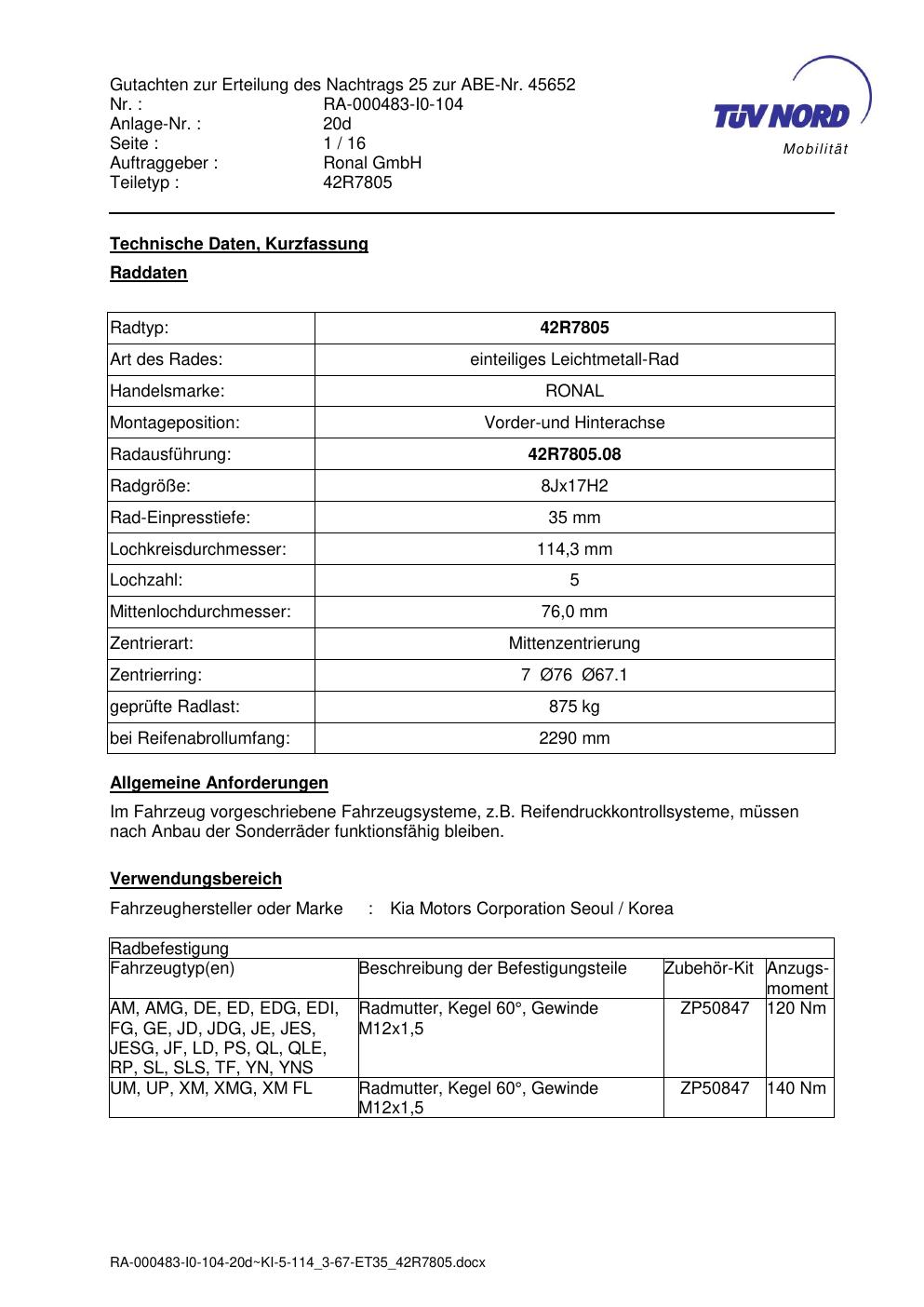 Dieses Gutachten (abe) bezieht sich auf die Alufelge brand-ronal 42R7805 in der Ausführung 8Jx17 ET 0, Mittenloch 0 mm (KBA 45652). Im PDF findest du typischerweise zulässige Reifengrößen, Auflagen/Anbauhinweise und – je nach Dokument – Hinweise zur Eintragung.