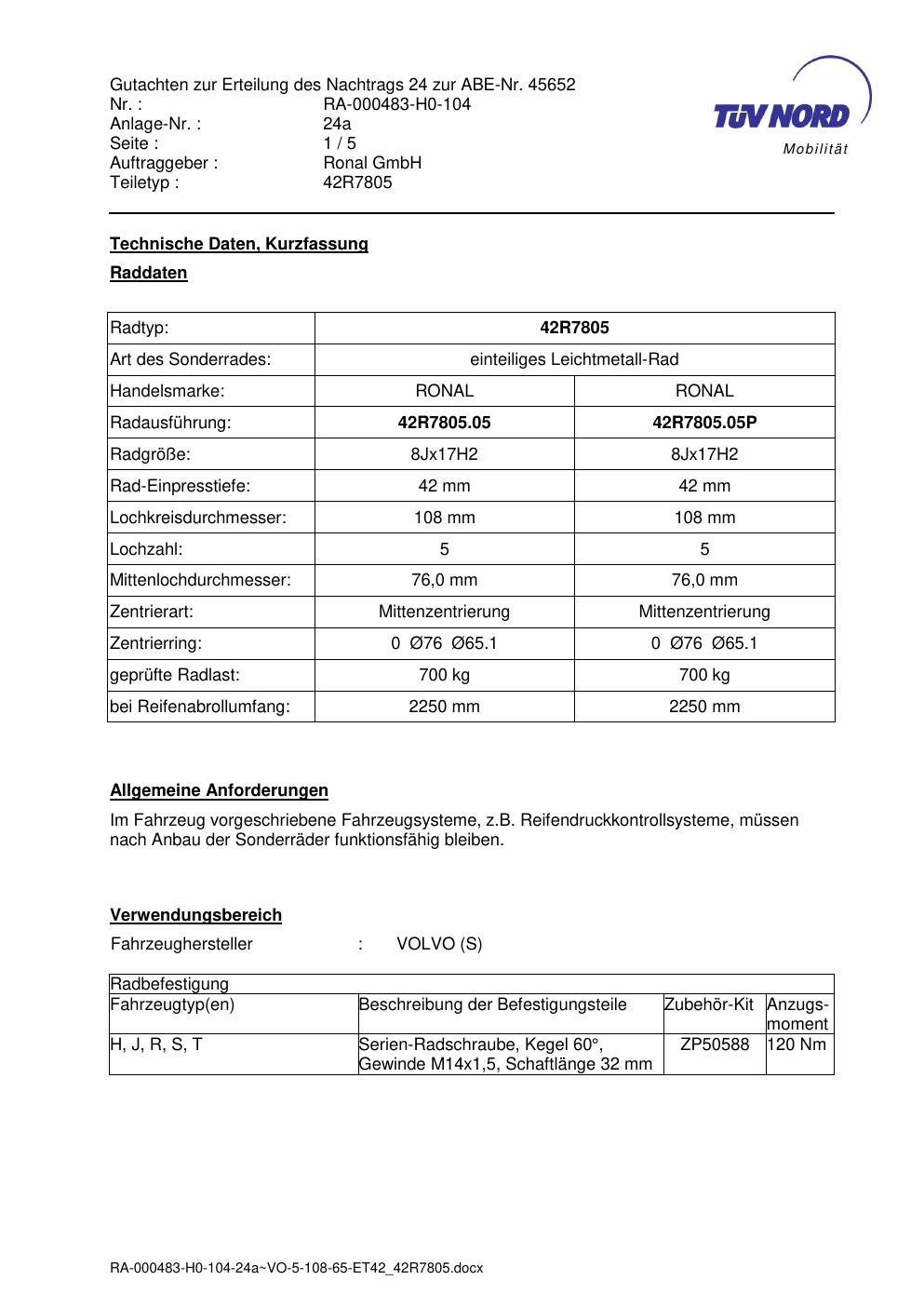 Dieses Gutachten (abe) bezieht sich auf die Alufelge brand-ronal 42R7805 in der Ausführung 8Jx17 ET 0, Mittenloch 0 mm (KBA 45652). Im PDF findest du typischerweise zulässige Reifengrößen, Auflagen/Anbauhinweise und – je nach Dokument – Hinweise zur Eintragung.