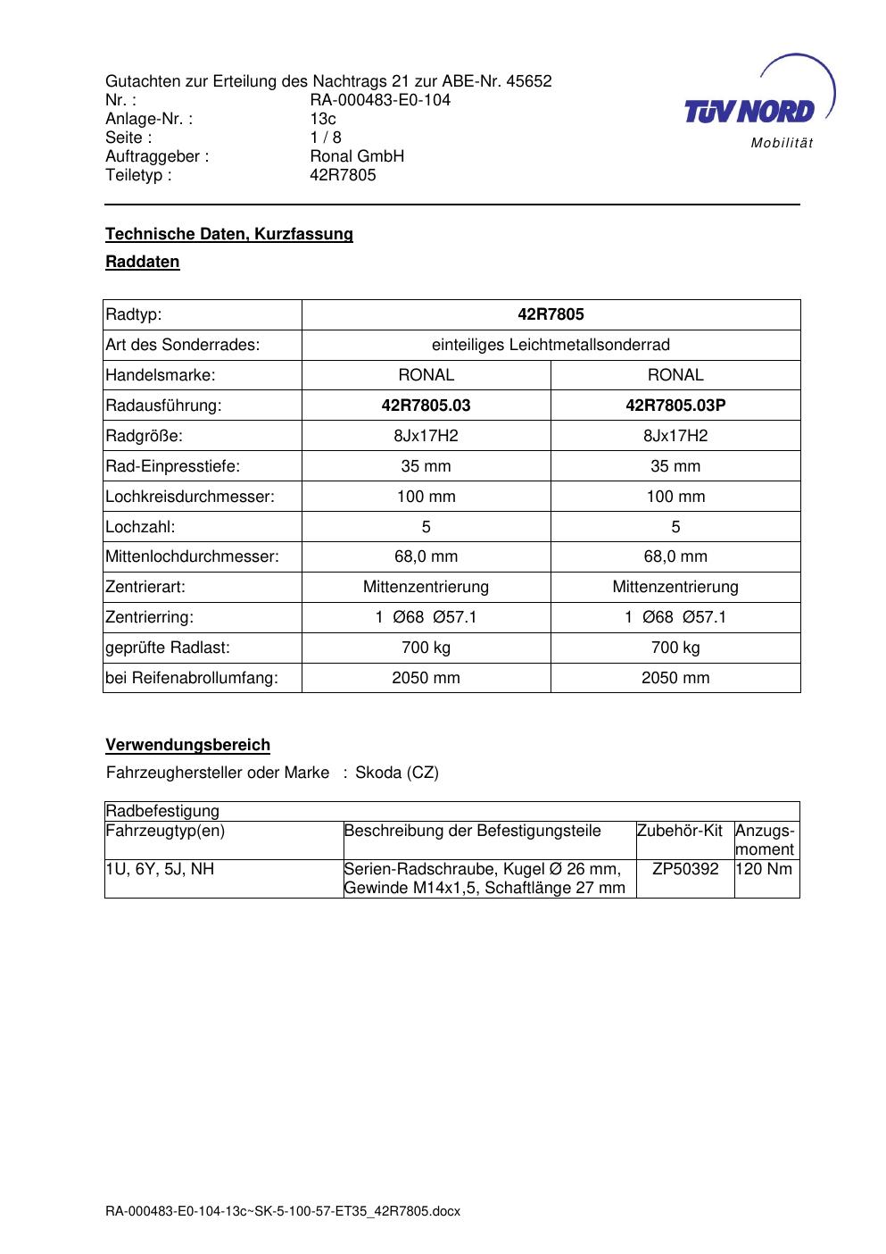 Dieses Gutachten (abe) bezieht sich auf die Alufelge brand-ronal 42R7805 in der Ausführung 8Jx17 ET 0, Mittenloch 0 mm (KBA 45652). Im PDF findest du typischerweise zulässige Reifengrößen, Auflagen/Anbauhinweise und – je nach Dokument – Hinweise zur Eintragung.