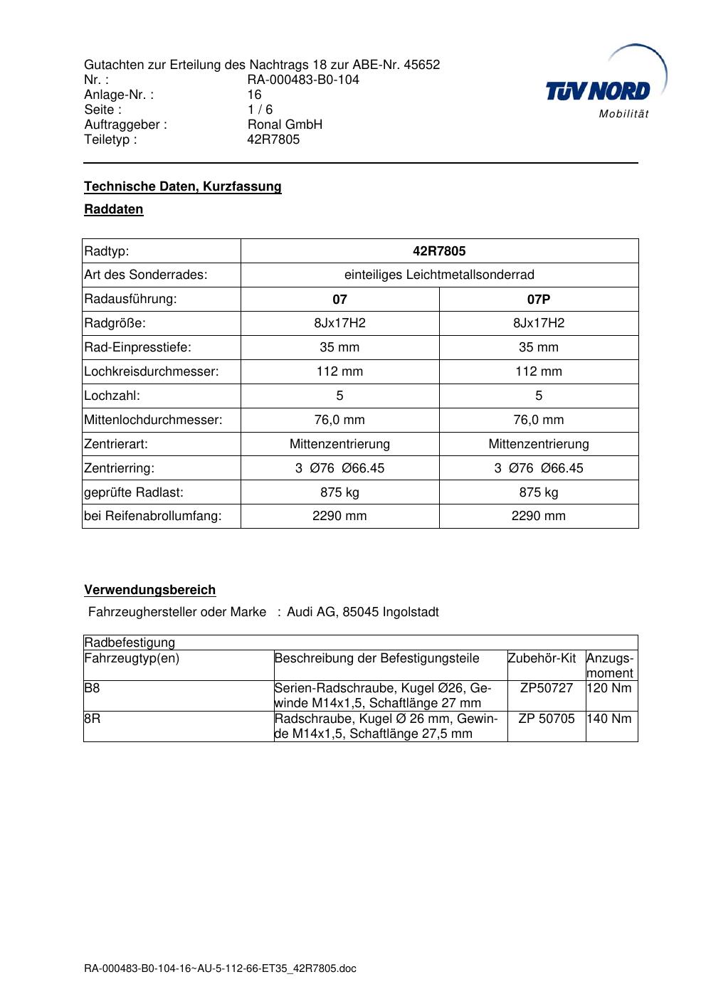 Dieses Gutachten (abe) bezieht sich auf die Alufelge brand-ronal 42R7805 in der Ausführung 8Jx17 ET 0, Mittenloch 0 mm (KBA 45652). Im PDF findest du typischerweise zulässige Reifengrößen, Auflagen/Anbauhinweise und – je nach Dokument – Hinweise zur Eintragung.