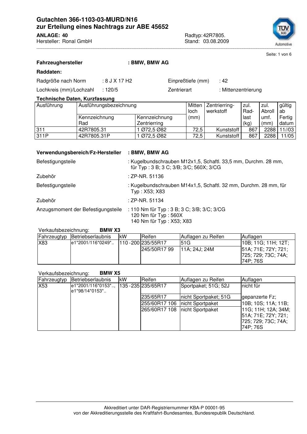 Dieses Gutachten (abe) bezieht sich auf die Alufelge Ronal 42R7805 in der Ausführung 8Jx17 ET 0, Mittenloch 0 mm (KBA 45652). Im PDF findest du typischerweise zulässige Reifengrößen, Auflagen/Anbauhinweise und – je nach Dokument – Hinweise zur Eintragung.