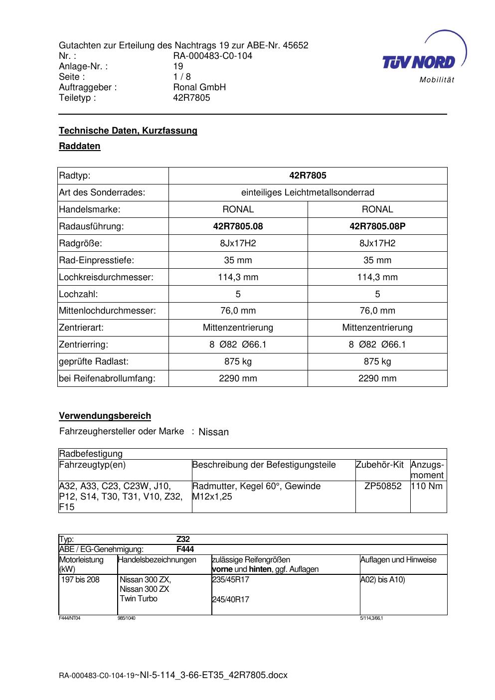Dieses Gutachten (abe) bezieht sich auf die Alufelge brand-ronal 42R7805 in der Ausführung 8Jx17 ET 0, Mittenloch 0 mm (KBA 45652). Im PDF findest du typischerweise zulässige Reifengrößen, Auflagen/Anbauhinweise und – je nach Dokument – Hinweise zur Eintragung.