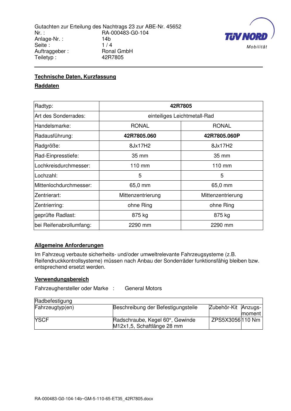 Dieses Gutachten (abe) bezieht sich auf die Alufelge brand-ronal 42R7805 in der Ausführung 8Jx17 ET 0, Mittenloch 0 mm (KBA 45652). Im PDF findest du typischerweise zulässige Reifengrößen, Auflagen/Anbauhinweise und – je nach Dokument – Hinweise zur Eintragung.