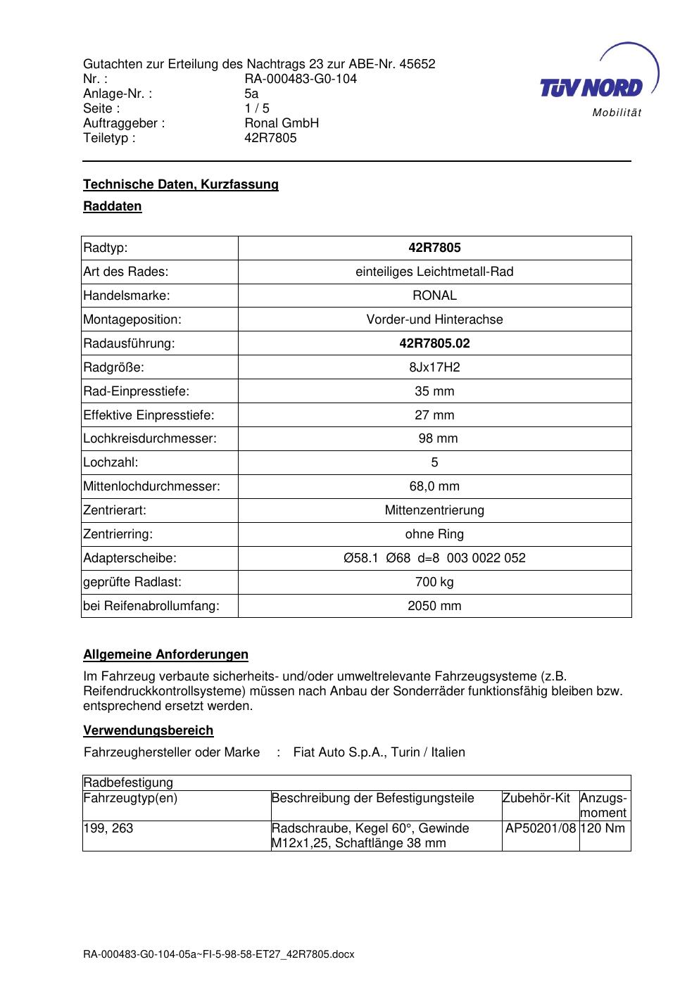 Dieses Gutachten (abe) bezieht sich auf die Alufelge brand-ronal 42R7805 in der Ausführung 8Jx17 ET 0, Mittenloch 0 mm (KBA 45652). Im PDF findest du typischerweise zulässige Reifengrößen, Auflagen/Anbauhinweise und – je nach Dokument – Hinweise zur Eintragung.