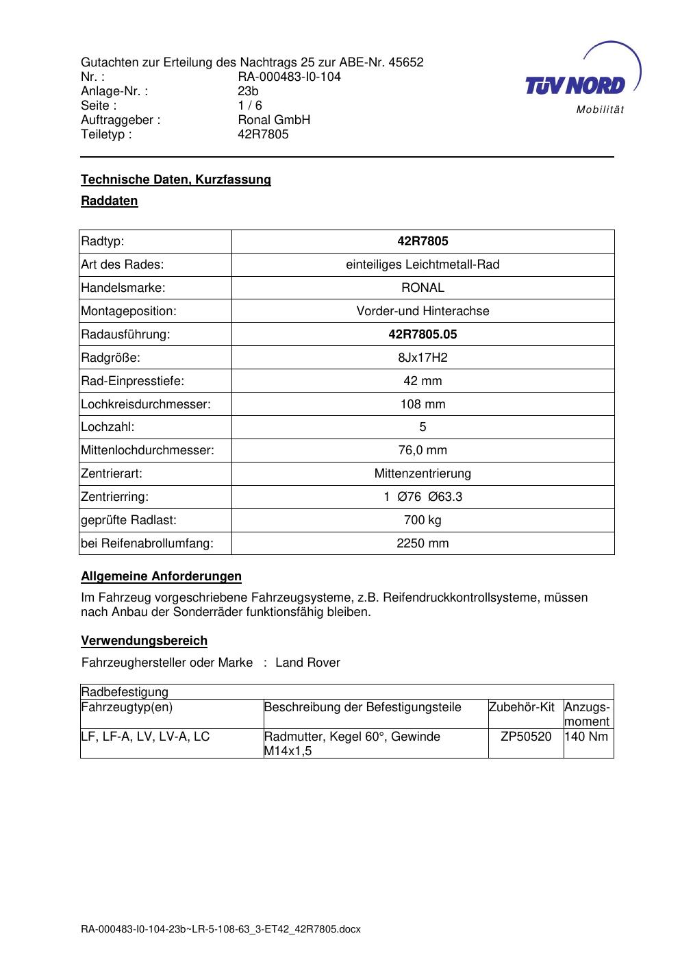 Dieses Gutachten (abe) bezieht sich auf die Alufelge brand-ronal 42R7805 in der Ausführung 8Jx17 ET 0, Mittenloch 0 mm (KBA 45652). Im PDF findest du typischerweise zulässige Reifengrößen, Auflagen/Anbauhinweise und – je nach Dokument – Hinweise zur Eintragung.