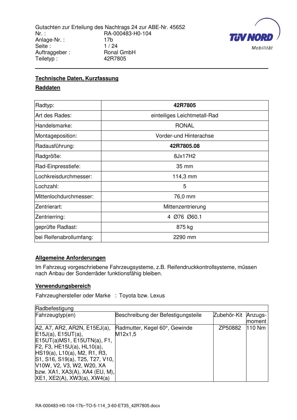 Dieses Gutachten (abe) bezieht sich auf die Alufelge brand-ronal 42R7805 in der Ausführung 8Jx17 ET 0, Mittenloch 0 mm (KBA 45652). Im PDF findest du typischerweise zulässige Reifengrößen, Auflagen/Anbauhinweise und – je nach Dokument – Hinweise zur Eintragung.