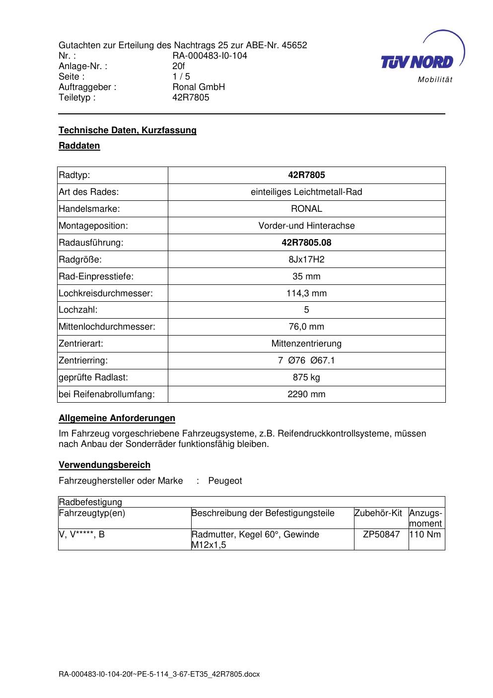 Dieses Gutachten (abe) bezieht sich auf die Alufelge brand-ronal 42R7805 in der Ausführung 8Jx17 ET 0, Mittenloch 0 mm (KBA 45652). Im PDF findest du typischerweise zulässige Reifengrößen, Auflagen/Anbauhinweise und – je nach Dokument – Hinweise zur Eintragung.