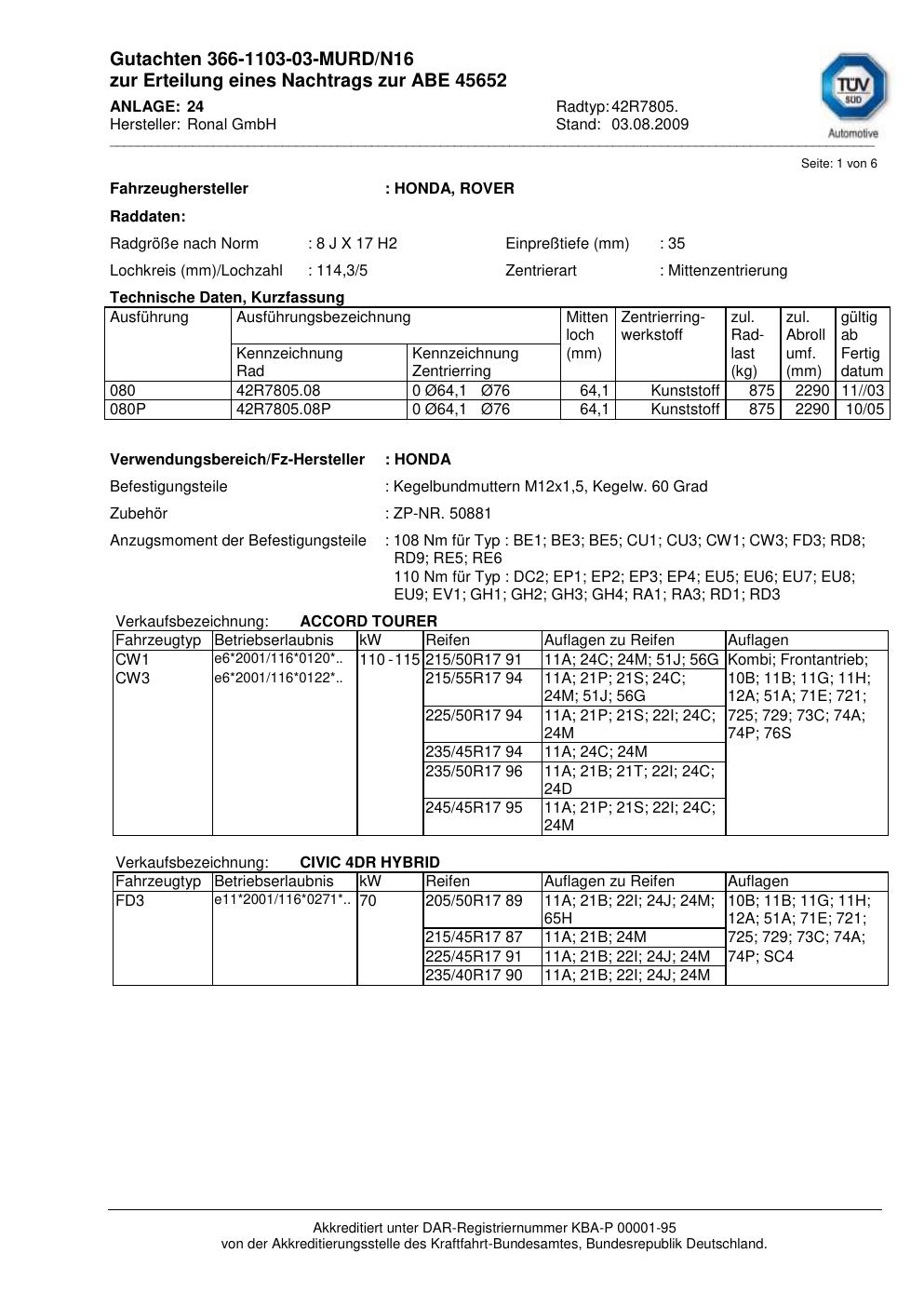 Dieses Gutachten (abe) bezieht sich auf die Alufelge Ronal 42R7805 in der Ausführung 8Jx17 ET 0, Mittenloch 0 mm (KBA 45652). Im PDF findest du typischerweise zulässige Reifengrößen, Auflagen/Anbauhinweise und – je nach Dokument – Hinweise zur Eintragung.