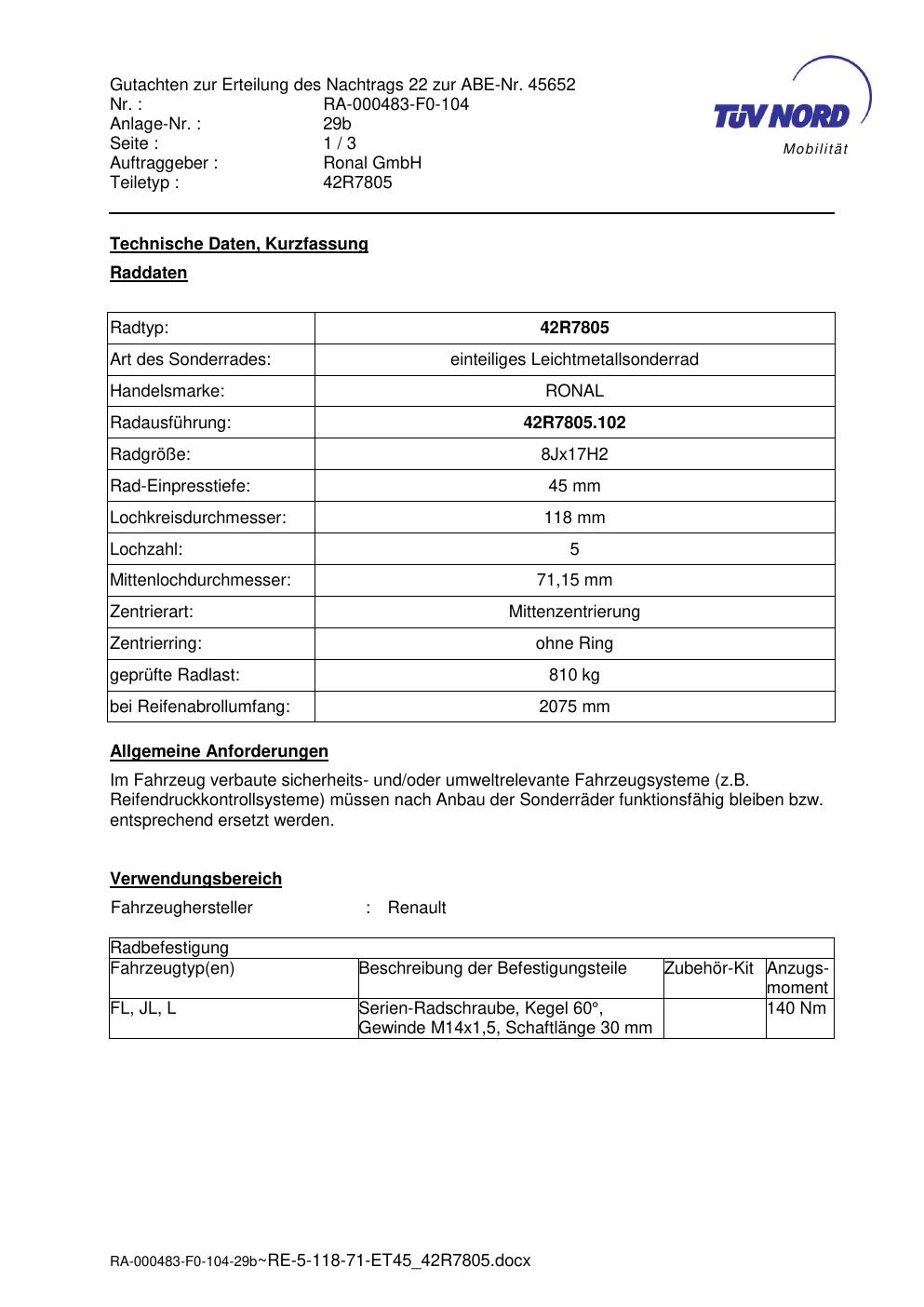 Dieses Gutachten (abe) bezieht sich auf die Alufelge brand-ronal 42R7805 in der Ausführung 8Jx17 ET 0, Mittenloch 0 mm (KBA 45652). Im PDF findest du typischerweise zulässige Reifengrößen, Auflagen/Anbauhinweise und – je nach Dokument – Hinweise zur Eintragung.