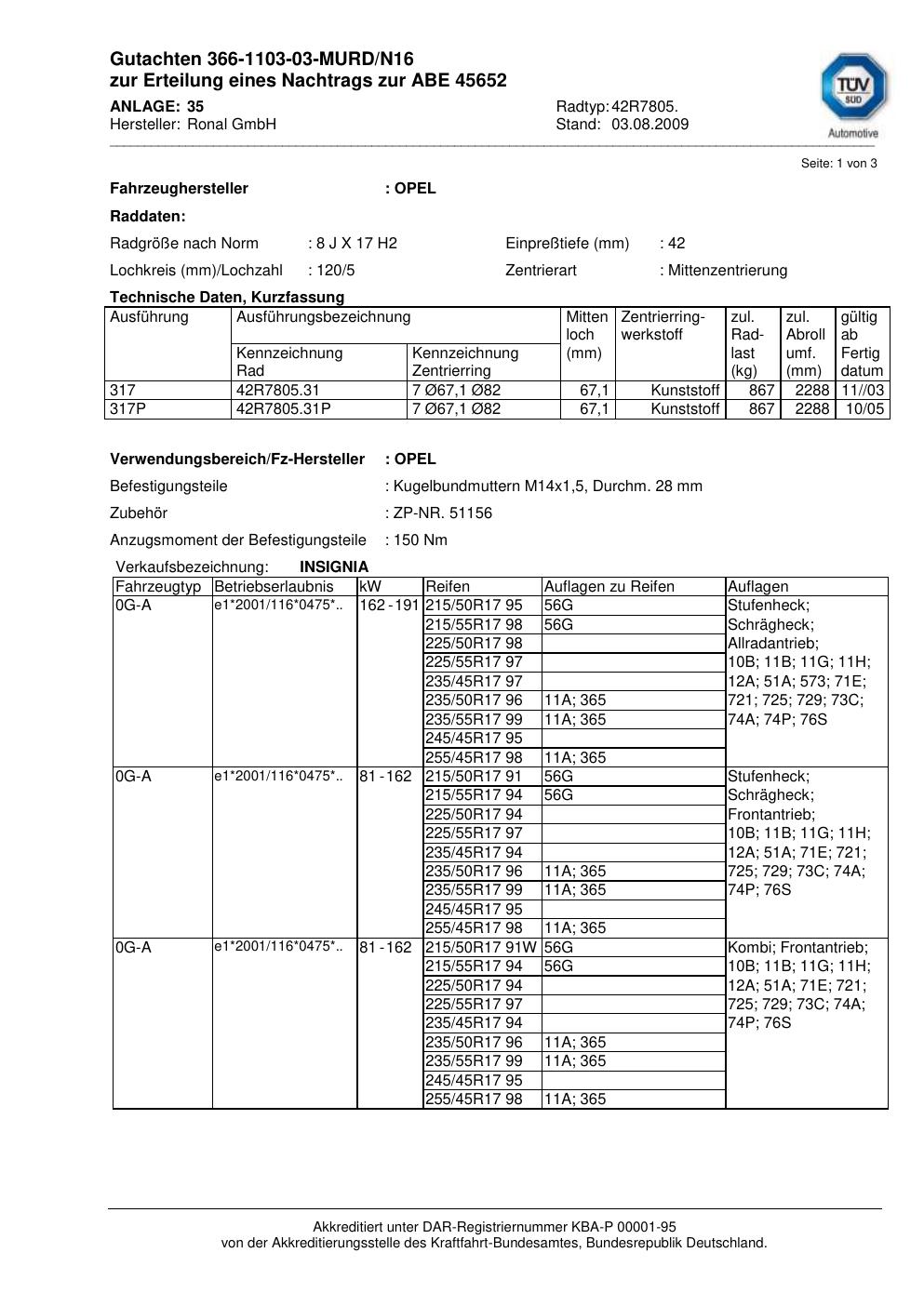 Dieses Gutachten (abe) bezieht sich auf die Alufelge Ronal 42R7805 in der Ausführung 8Jx17 ET 0, Mittenloch 0 mm (KBA 45652). Im PDF findest du typischerweise zulässige Reifengrößen, Auflagen/Anbauhinweise und – je nach Dokument – Hinweise zur Eintragung.