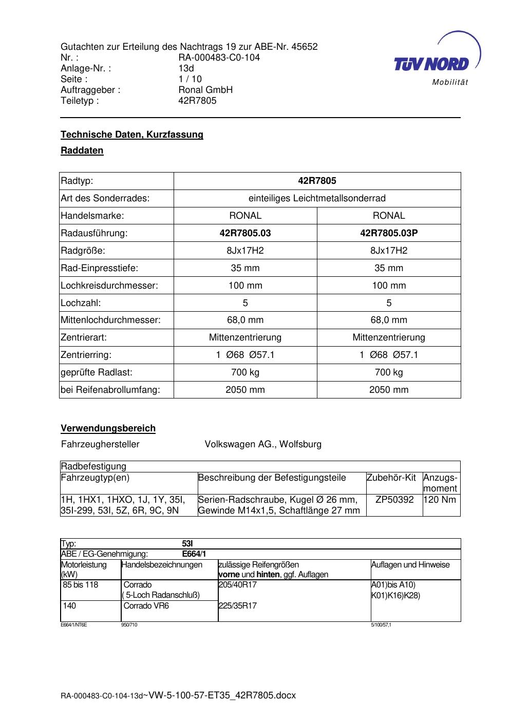 Dieses Gutachten (abe) bezieht sich auf die Alufelge brand-ronal 42R7805 in der Ausführung 8Jx17 ET 0, Mittenloch 0 mm (KBA 45652). Im PDF findest du typischerweise zulässige Reifengrößen, Auflagen/Anbauhinweise und – je nach Dokument – Hinweise zur Eintragung.
