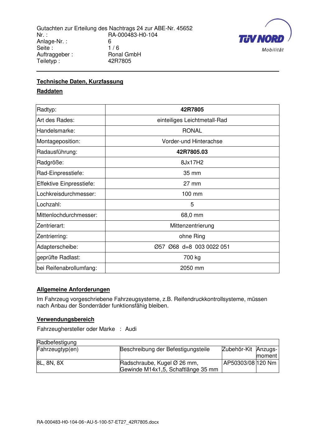 Dieses Gutachten (abe) bezieht sich auf die Alufelge brand-ronal 42R7805 in der Ausführung 8Jx17 ET 0, Mittenloch 0 mm (KBA 45652). Im PDF findest du typischerweise zulässige Reifengrößen, Auflagen/Anbauhinweise und – je nach Dokument – Hinweise zur Eintragung.
