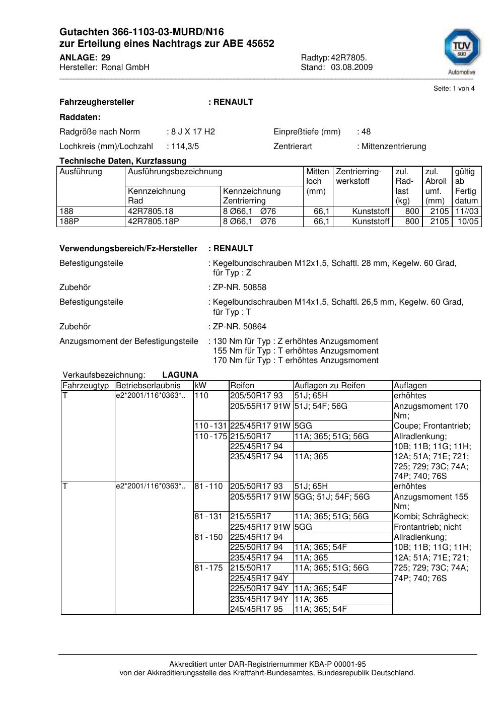 Dieses Gutachten (abe) bezieht sich auf die Alufelge Ronal 42R7805 in der Ausführung 8Jx17 ET 0, Mittenloch 0 mm (KBA 45652). Im PDF findest du typischerweise zulässige Reifengrößen, Auflagen/Anbauhinweise und – je nach Dokument – Hinweise zur Eintragung.